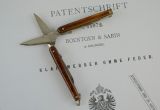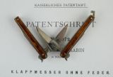 Die Patentschrift beschreibt die technische Neuerung im Eingangssatz mit der prägnanten Aussage „Das Messer hat die Eigenthümlichkeiten, zusammengeklappt ringsum ganz von der Schale bedeckt zu sein, keine Feder zu besitzen und im aufgeklappten Zustande nach beiden Richtungen hin gegen das Zuklappen gesichert zu sein.“