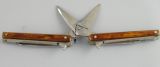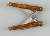 zusammengeklappt unter 6 cm Länge, mit Messerklinge, Nagelfeile und Schere, Griffschalen aus edlem Schildpatt.
