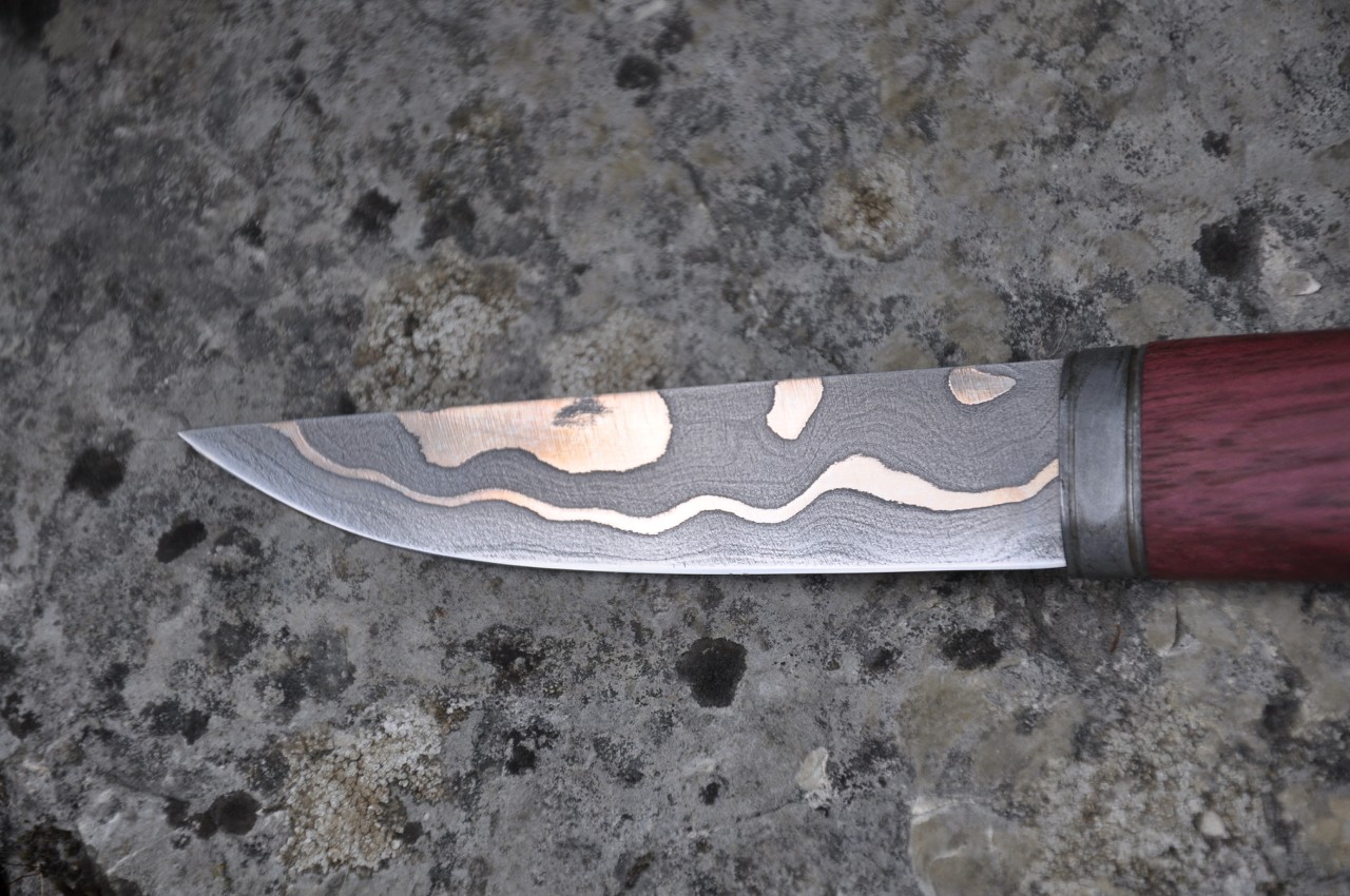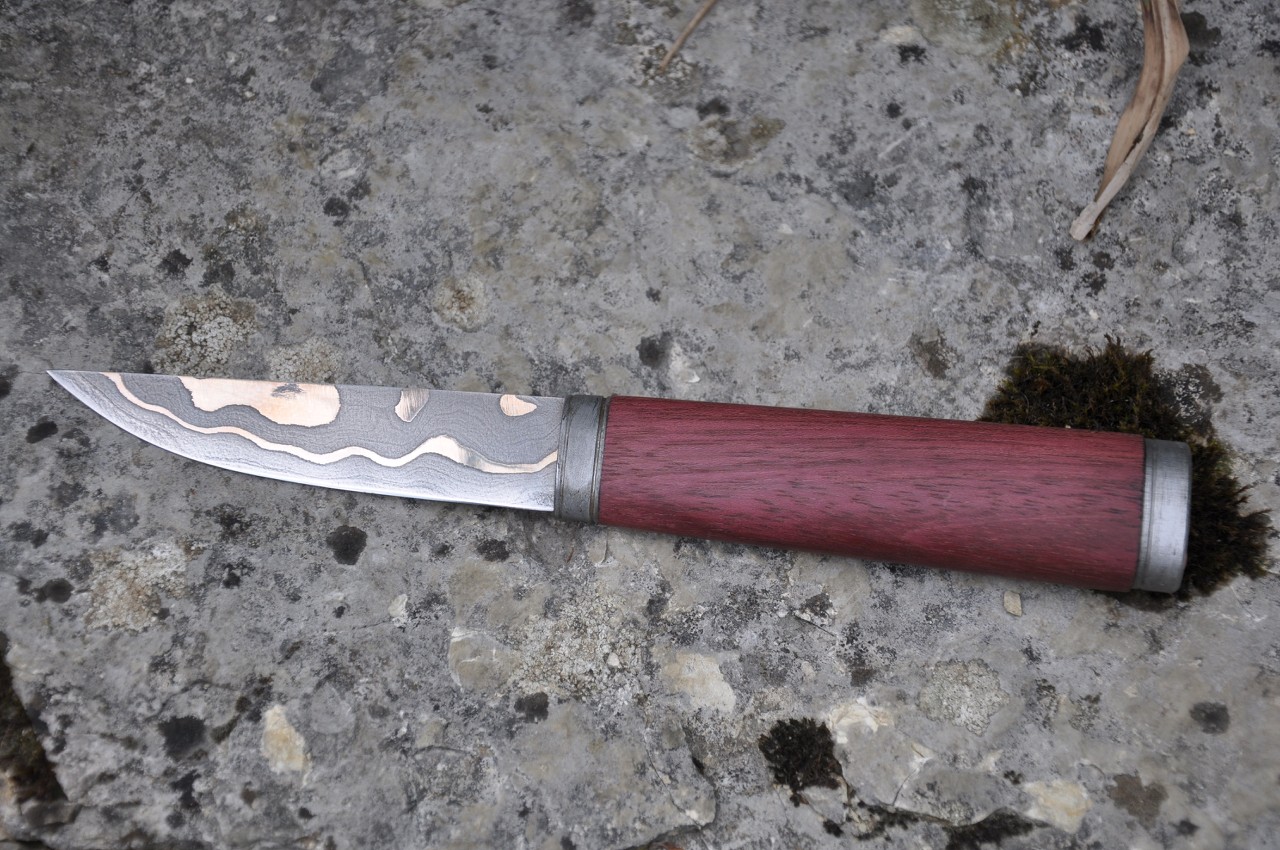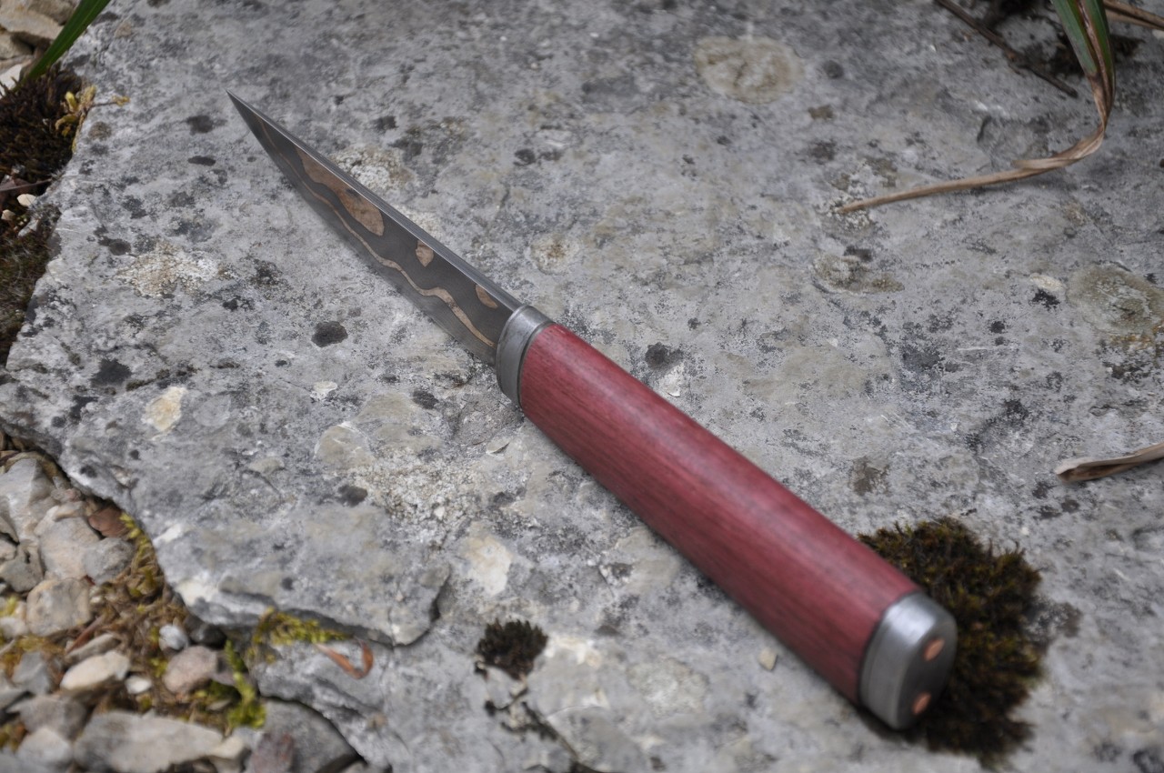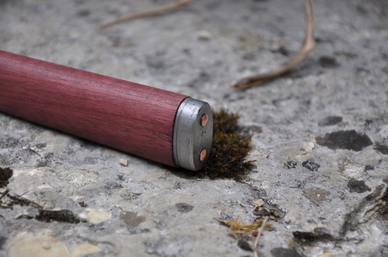 Der Griff ist aus Amaranth, Puddel und Kupfernieten/Nägeln.