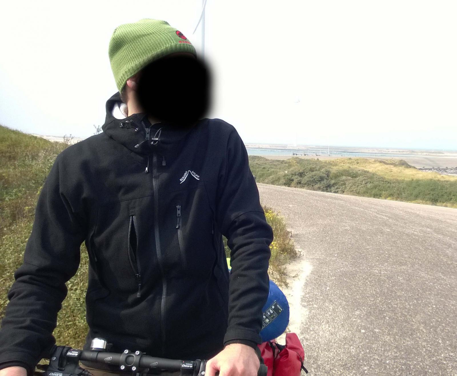 Bei gefühlter Windstärke 12 an Hollands Westküste pfeift der Wind ordentlich durch den Loden. Darunter hatte ich ein T-Shirt und einen dünnen Baumwollpulli. Kalt wurd mir nicht, weil ich permanent am Strampeln war. :cool:
