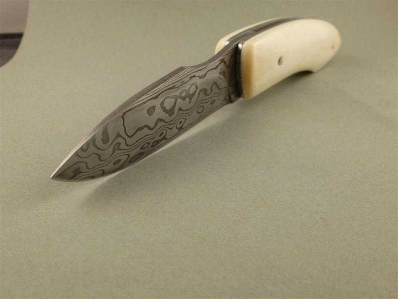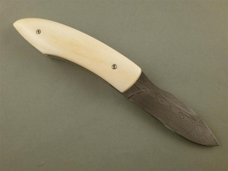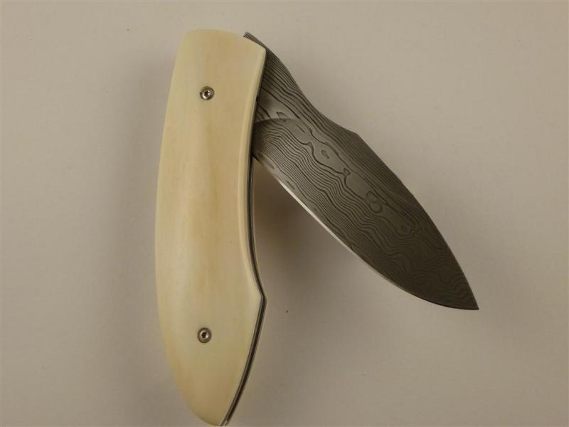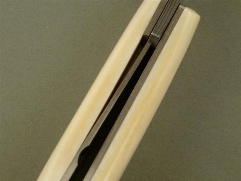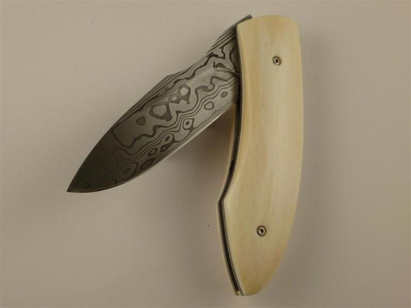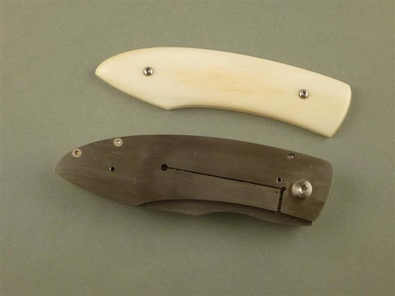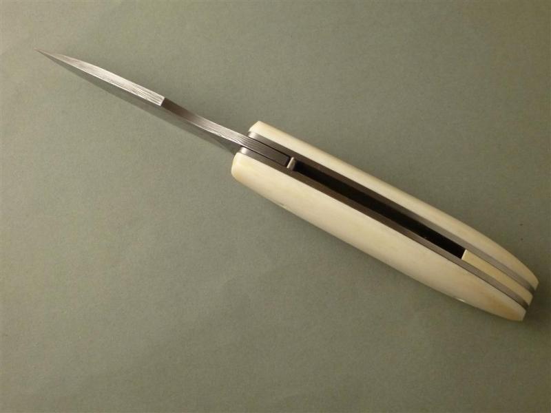 Entstanden in einem meiner Klappmesserkurse, Vorlage war ein Messer von mir, welches der Teilnehmer abgewandelt hat. Mit ein bisschen Hilfe von mir, besonders was die Mechanik anging ist er eben sehr stolz und zufrieden nach Hause gefahren.