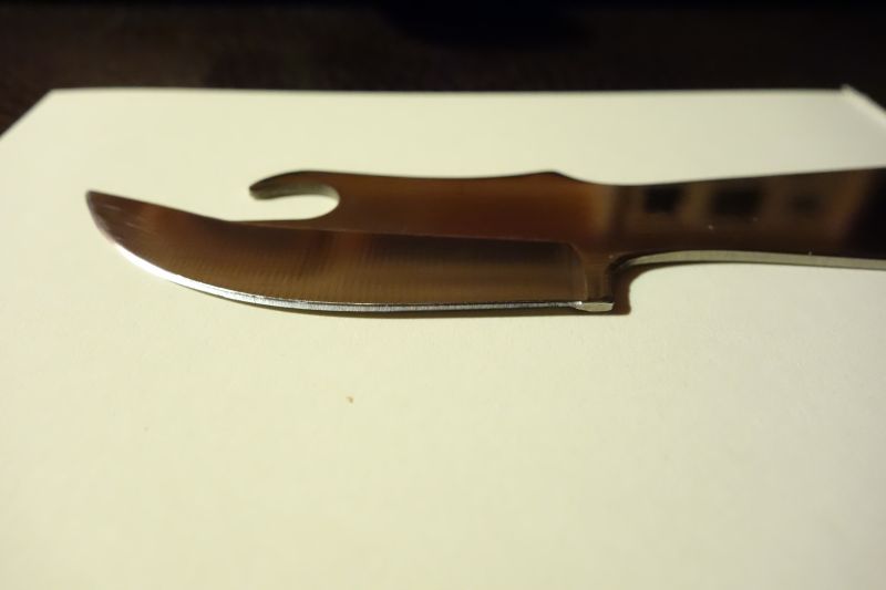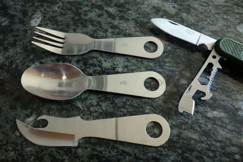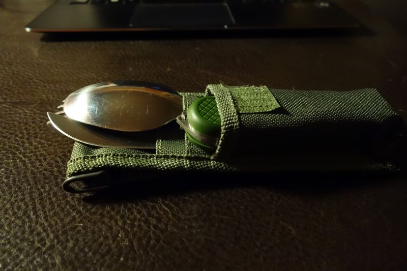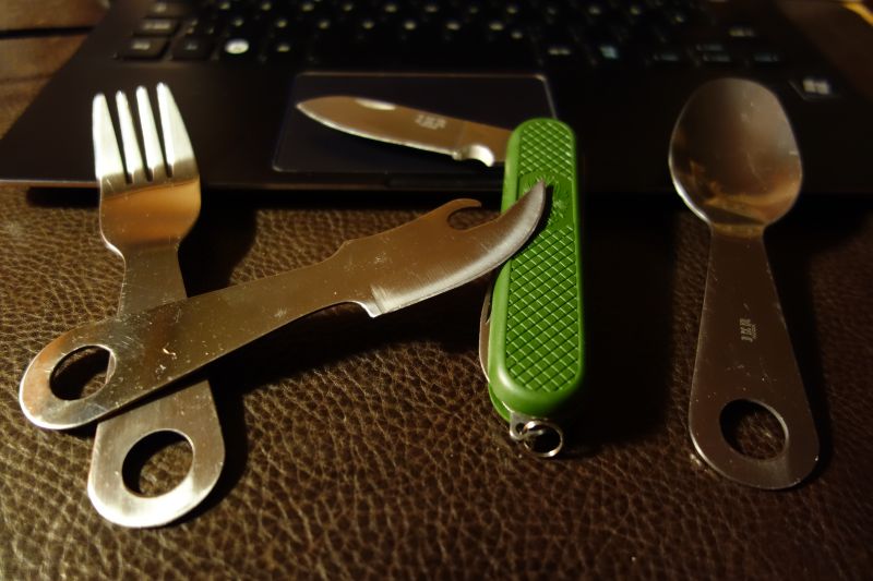 Ohne großes Tamtam haben wir das Package eingetütet und sind zu Carlos auf eine Verschnaufpause. Kaufen schwächt ja nicht nur den Geldbeutel, sondern ist auch mental immer wieder ein Prozeß ständigen Abwägens: Muß, soll, kann, darf das denn sein. Oder ne, oder - nun doch! Carlos wollte eigentlich nur Little John befingern, den ich, wie meistens, mithatte. So konnte ich in Ruhe ein paar erste Bilder machen. Messer, Gabel, Schere … Doch halt, das wird ja ein Kindergedicht. Nein, Messer, Gabel, Löffel - und noch’n Messer, dieses zum Schnitzelschnippeln, falls mal eins auf dem Teller liegt. Erstaunlich scharf das „Zweitmesser“. Andere hätten etwas Paracord drumgewurstelt, eine Scheide gebacken und es als Neckbowie für einen Tarif von sage und schreibe auf den Markt geworfen :cool:. Joker wirft es einfach hinterher. Es schneidet saumäßig was ab. Ohne vorheriges Sharpmakern. Könnten wir ein kleines „Projekt von machen: Paracord dranwursteln … Gut abschneiden tut das große Grüne allerdings auch out of the Karton.