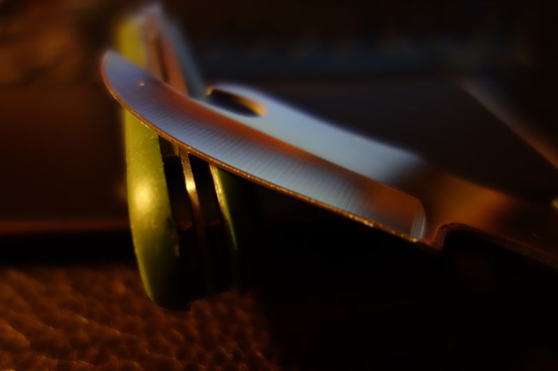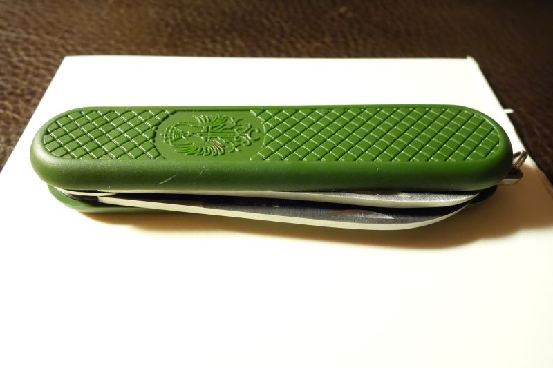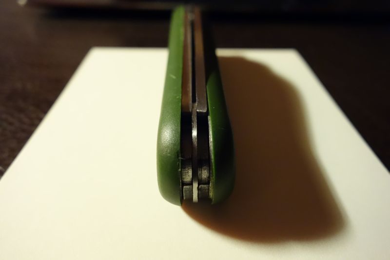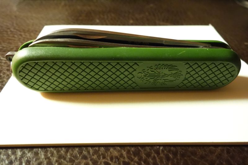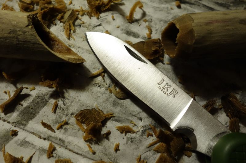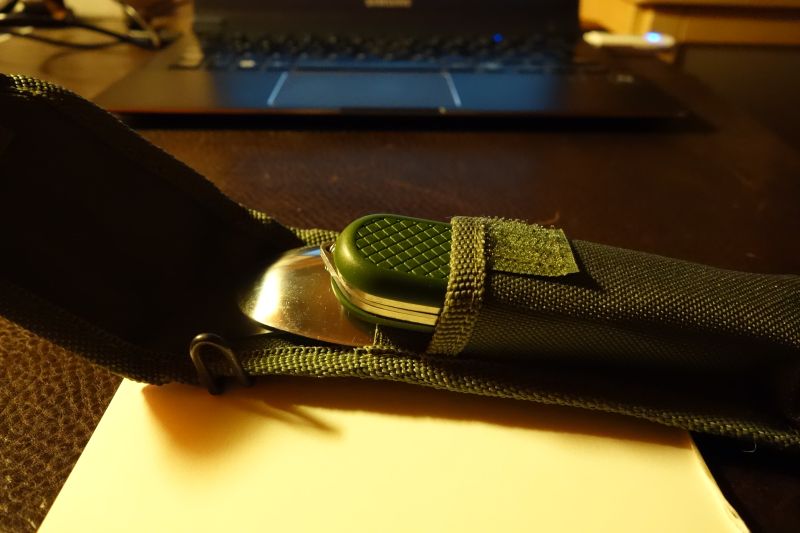 Abends haben wir dann den Nutzwert des Messers mal abgecheckt. Brötchen, Käse, Tomate, Senf auf die Stulle: Perfektes Gerät für das! Nach einer kurzen Verdauungspause (für Johnny - der AUCH gegessen hat :hehe:- das Grüne und mich) ging es dann an die Arbeit. Stöckchen halbieren, anspitzen und sonstwie rumschnippeln. Kein Thema. Scharf und stabil das Grüne. Keine Ermüdungserscheinungen. Kein Klingenklimpern oder -wackeln. Liegt wegen seiner Größe gut und fest in der Hand. Ordentlicher Grip. Erinnerte etwas an alte Bundeswehrzeiten. Kabel- oder Leinenschneider am Klingenfuß (Ricasso heißt das Teil, aber hier isses eben wegen Kabelschneider scharf). Und dann noch die zweite „Klinge“: Dosenöffner, Flaschenöffner, Schraubendreher für 4 Größen. Der leichten Griffschalen wegen ist das Messer insgesamt eher als leicht zu bezeichnen.