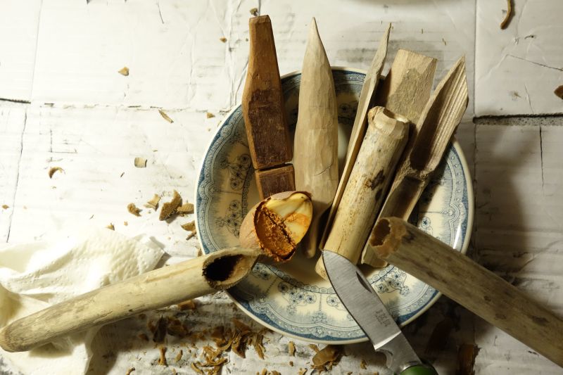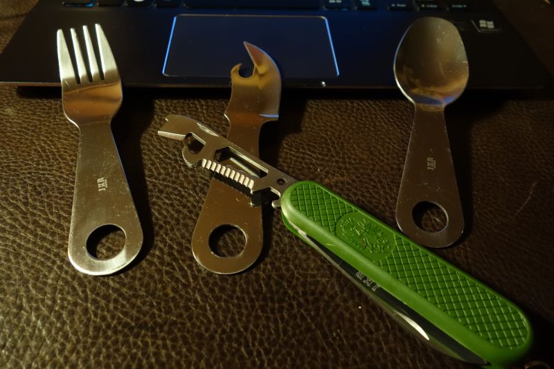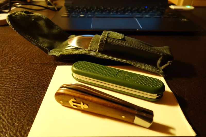 Mittlerweile hat sich übrigens so Einiges an „Einfach-Messer-Projekten“ nebst Hölzchen und Stöckchen angesammelt im Roadhouse. Aber so isses! Messer, Gabel und Löffel zum Speisen, die beiliegen in der Nylon-Gürteltasche, sind kurz und groß. Da geht ordentlich was drauf. Und das Messerchen ist rattenscharf geschliffen. Nachdem wir abends noch die Gesamtpackung dokumentiert haben und das Grüne neben unsere beiden anderen Jokermessern positioniert haben, sind wir zu Bett.