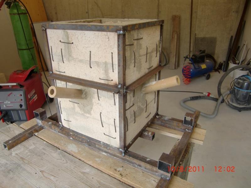 .....Anbei die neuesten Fotos von meinem Rennofenprojekt...... aus Schamottesteinen gebaut und in einem Stahlkäfig gefasst. Die Steine sind mit Schamottmörtel und Hafnerklammern verbunden......Vor der Ofenreise wird der Innenraum noch mit Lehm ausgekleidet....... jedoch ist mein momentanes Ziel, einen möglichst haltbaren und wirkungsvollen Ofen zu basteln.......