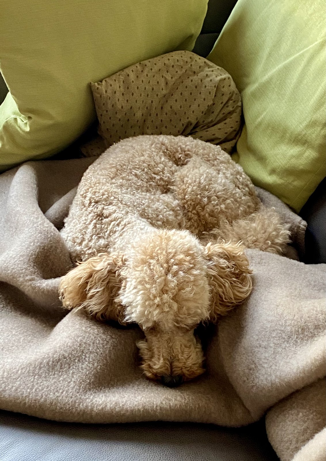 Dann alles Gute an den kleinenMein Pudelchen war krank. Blut im Kot, nix gefressen, Bauchschmerzen. Große Untersuchung, ich habe mir Sorgen gemacht. Zum Glück nichts ernstes gefunden. Hier hat er es sich gemütlich gemacht: