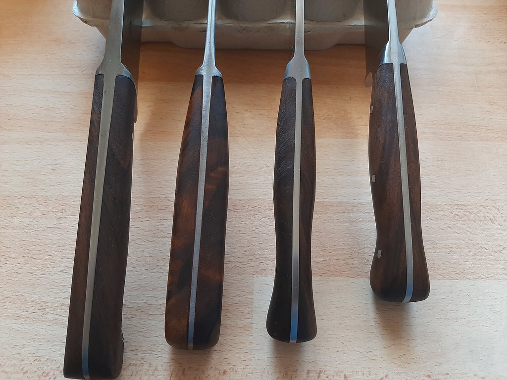 So hier mal, nicht handselektierte Herder (einfach die günstigsten aus dem Versandhandel) VS vergleichbare Griffe von gestandenen Messermachern (wie gesagt mit so ca. 10 Std. Zeitaufwand....)