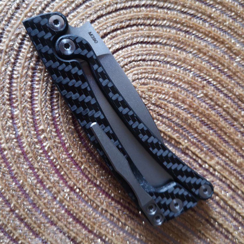 Superleicht, superlegal, schließt interessant, gehärtete Achsen, Scheiben aus Bronze, Karbon, m390. Kein Klingenspiel, alles mittig, Hohlschliff, daher schneidet auch gut.