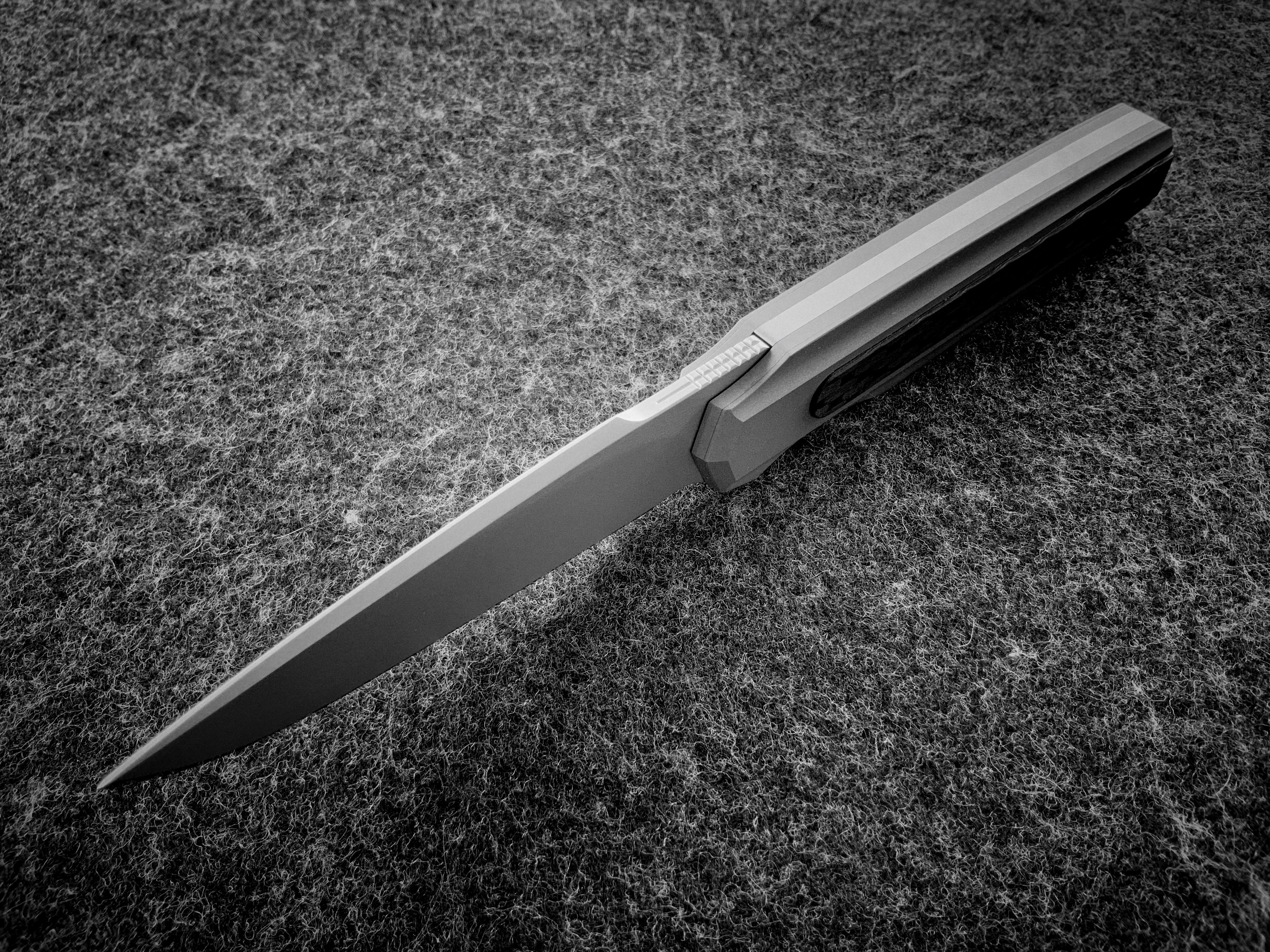 Mein gezeigter Prototyp der Chimäre hat 21,5cm Gesamt- bei 9,5cm Klingenlänge und 179gr Gewicht. Die Klinge ist aus SB1 Stahl und wie der Backspacer feingestrahlt.