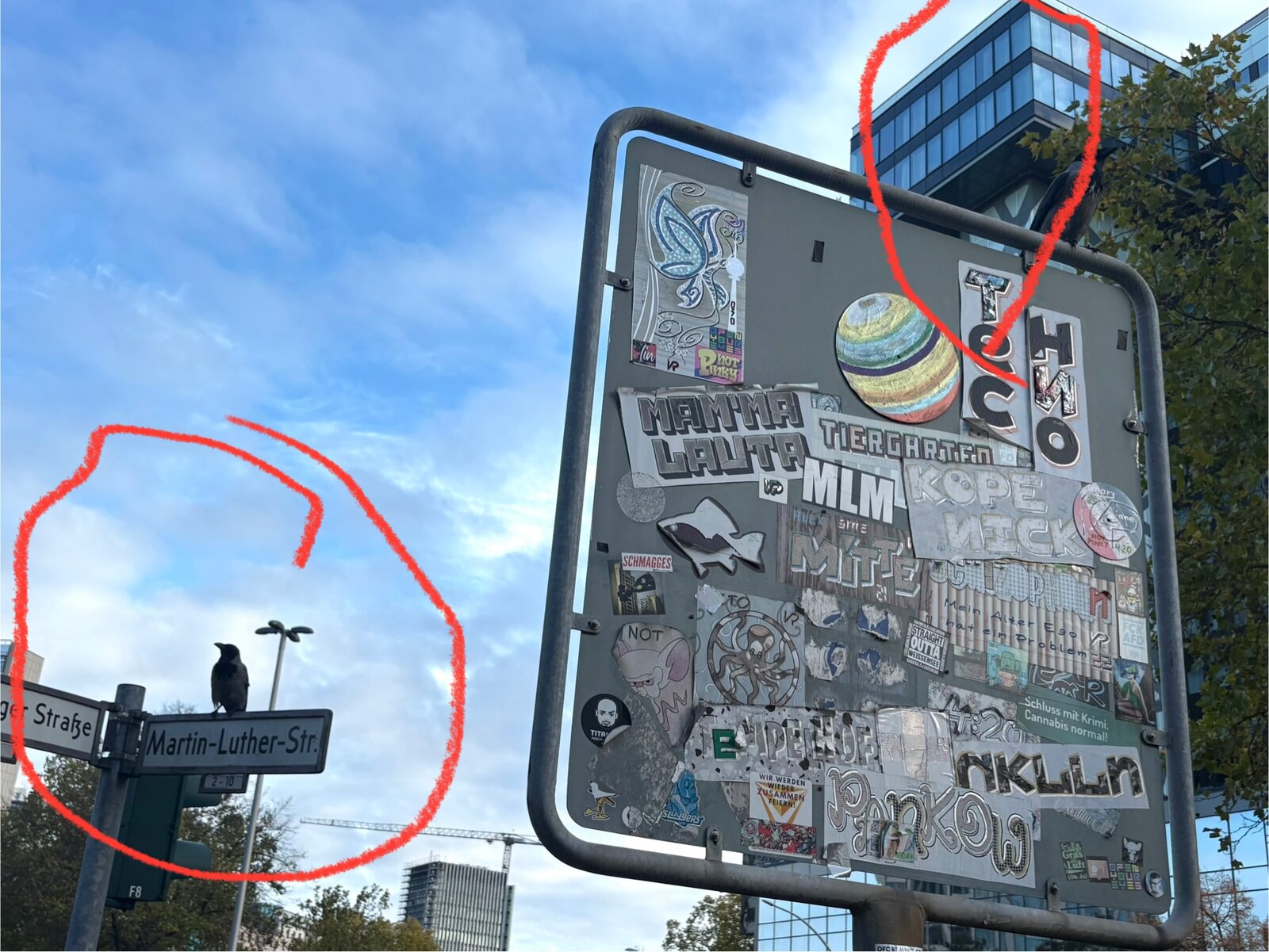 Mir ist das ein liebgewonnenes Ritual geworden. Wir werden wirklich erwartet. Dieser Teil des Weges ist ein begrünter, breiter Mittelstreifen, die Junxx 🐦⬛🐦⬛ haben sich das anscheinend territorial in Abschnitte eingeteilt.