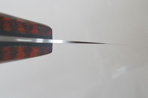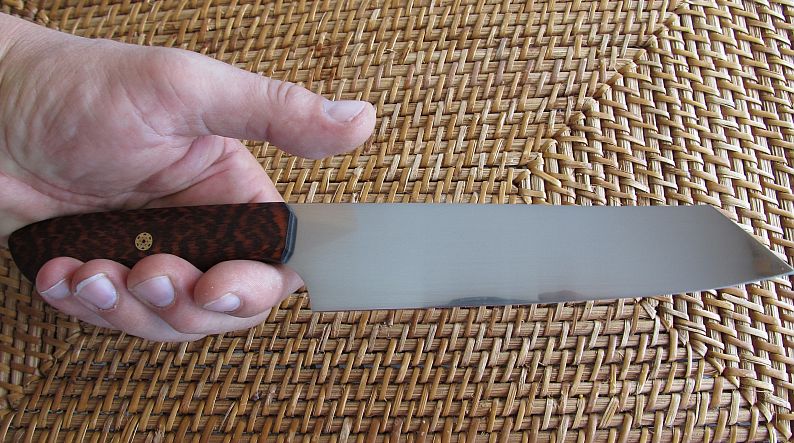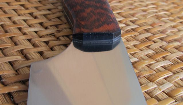 Die Klinge ist fast auf Null geschliffen ( natürlich nach dem Härten – von Hand – viel Spaß macht das nicht) und scharf. Sie dient mir nun zu meiner eigenen Freude im täglichen Kücheneinsatz.