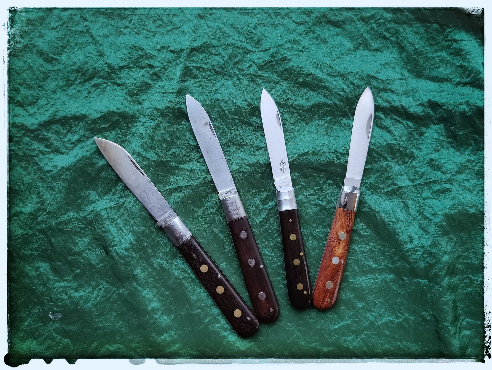 Ich habe heute vier Beispiele zu zeigen. Sie haben alle einen Holzgriff und alle haben 3 Nieten (nur auf der mark side). Ich habe Beispiele von verschiedenen Firmen mit 2 Nieten gesehen.