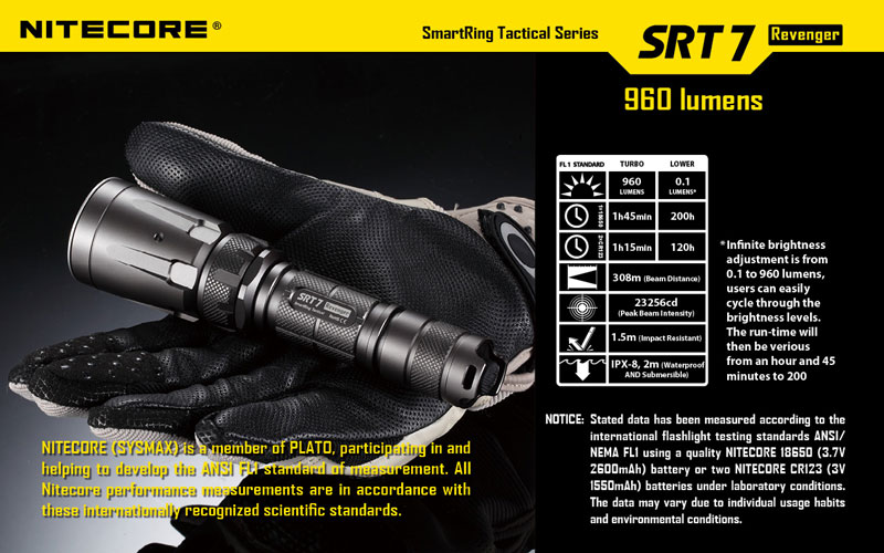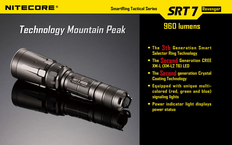 Die NiteCore SRT7 Revenger setzt wieder Maßstäbe in Funktion und Leistung. Die neueste CREE XM-L2 T6 LED leistet maximal 960 Lumen. Der Smart-Selektorring der 3. Generation ermöglicht ein stufenlose Regelung der Helligkeit von 0,1 Lumen bis 960 Lumen. Zusätzlich zur CREE XM-L2 T6 LED, verfügt die SRT7 Revenger über 3 Multi-Color-LED´s und ist so in der LAge auch rotes, grünes und blaues Licht zu liefern.