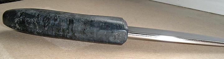 Beim Übergang zur Klinge gefällt mir gerade die Wickelstruktur und einen kleinen Guard hat es. Im oberen Bild ist er durch den Halm verdeckt, aber im unteren kann man ihn schon ein wenig sehen (das dunkle Eck über dem Wickelmuster). Wenn es fertig ist reiche ich ein besseres Bild nach.