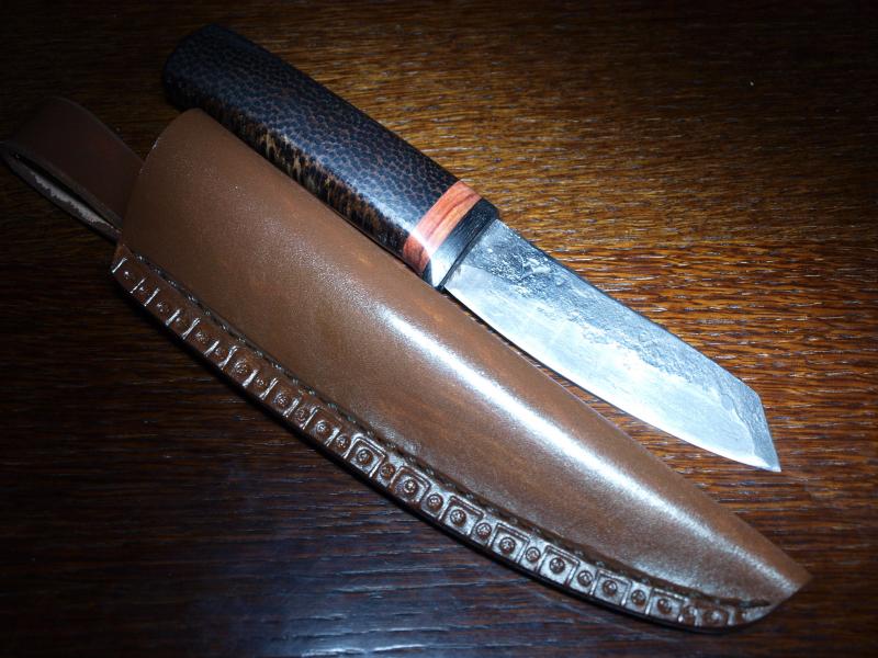 Messer ist 220mm lang, davon Klinge 110mm x 5mm Dreilagenstahl, 140g leicht und der Griff in der Hauptsache aus Black Palmyra.