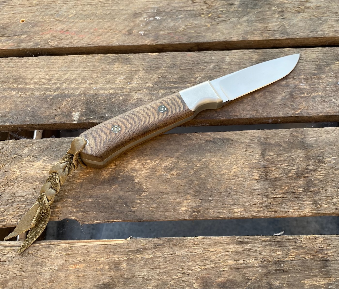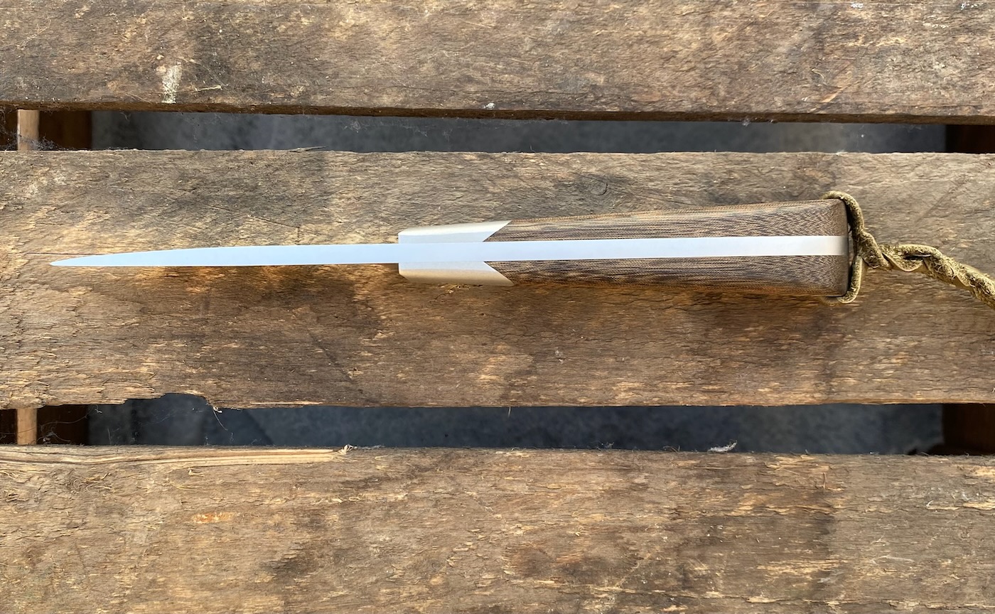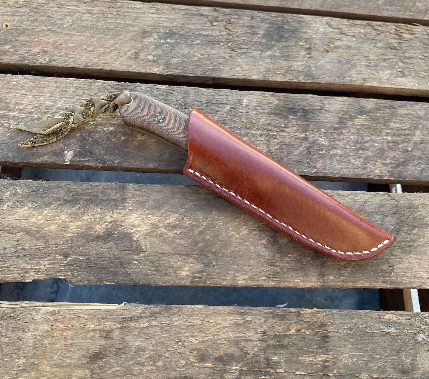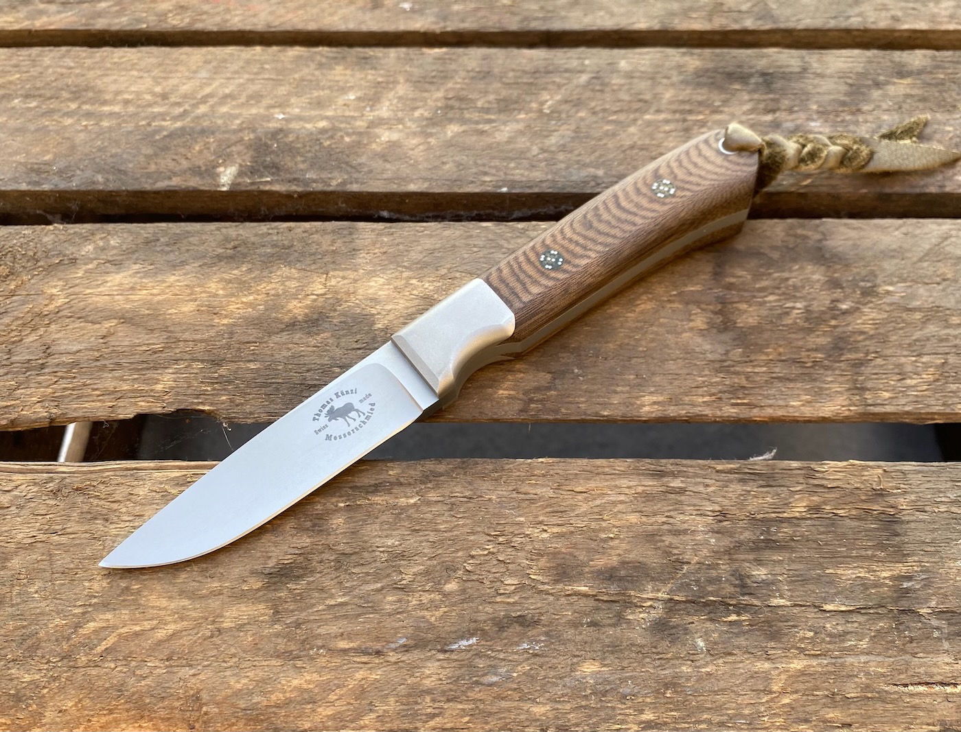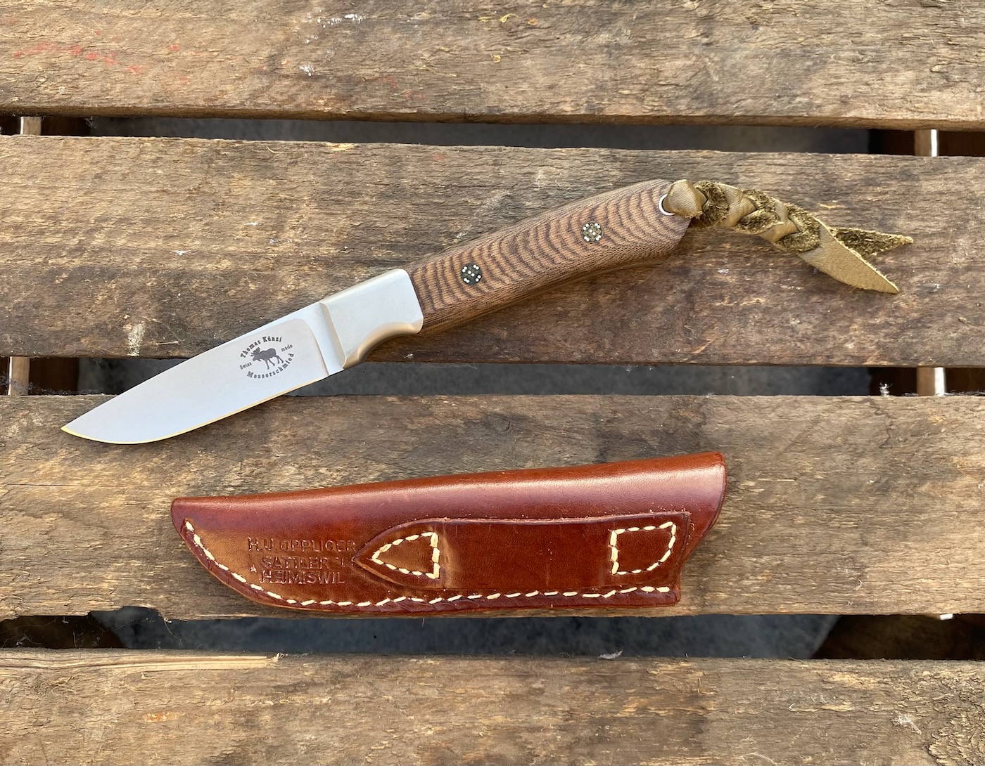 ATS-34, glasperlgestrahlt, Hohlschliff, Stahlbacken mit Schwalbenschwanz, Micarta, Lederlanyard, Lederscheide von H.U. Oppliger/Heimiswil