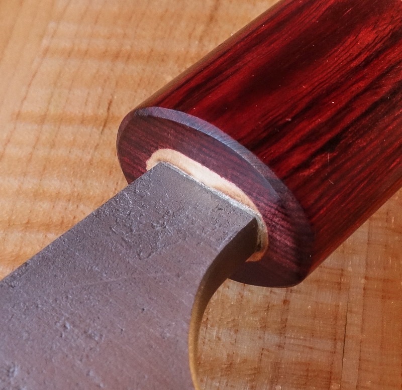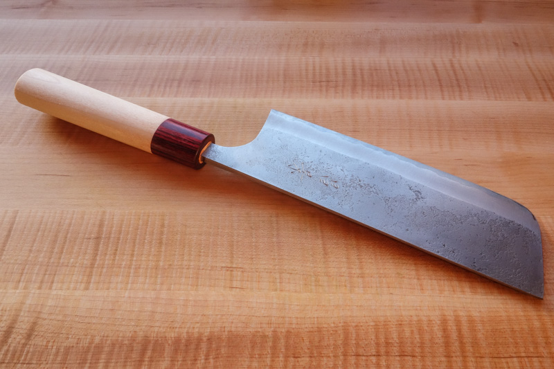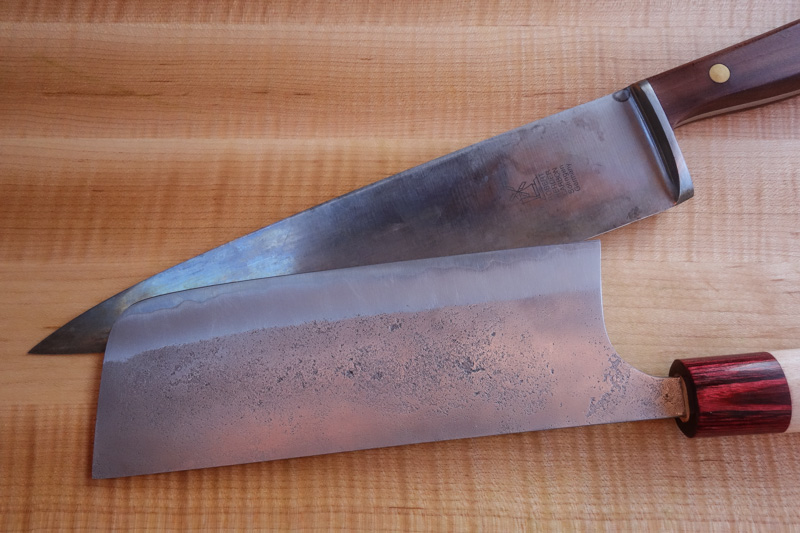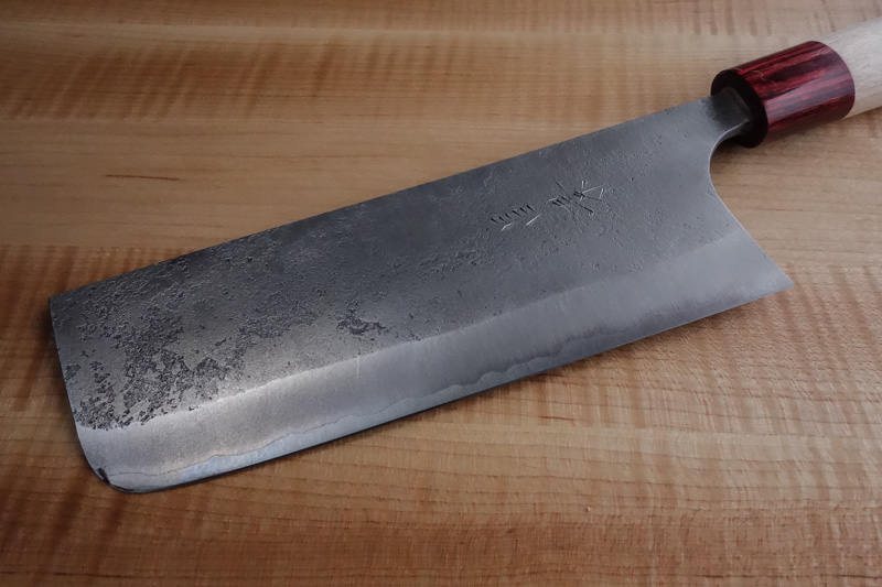 Klinge: Shirogami 2 Carbon Steel, 62-63 HRC, 50/50 Convex Grind, Clad with Stain (Kurouchi- oder Blacksmith-Finish) - Sharpened to a 15 degree angle