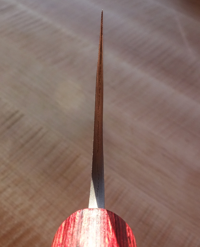Die sehr hoch gehärtete Aogami-Super-Klinge haben wir - ohne persönliche Erfahrung damit zu haben - aus reiner Vorsicht nicht genommen. Wenn das Sirou-Kamo-Aogami-Santoku im Roadhouse eintrifft, werden wir im Rahmen der Wahrheitsfindung nach einer Woche mal genau hinsehen.
