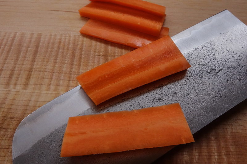 Da im kaufentscheidenden Video eine Möhre die Hauptrolle gespielt hat, galt der erste Schnitt einer ebensolchen. Ein paar Scheibchen und der Länge nach halbiert. Atemberaubend!! Da wir für einen gefühlten Vergleich kein Koichi Nakiri zur Hand hatten, mußten wir mit anderen Gerätschaften Vorlieb nehmen. Herder 1922 Office, Herder 1922 Kochmesser 23 cm, Schanz-Filet Petty und Schanz-Filet Santoku Little. Dann noch marvvins Office (die Mamba).