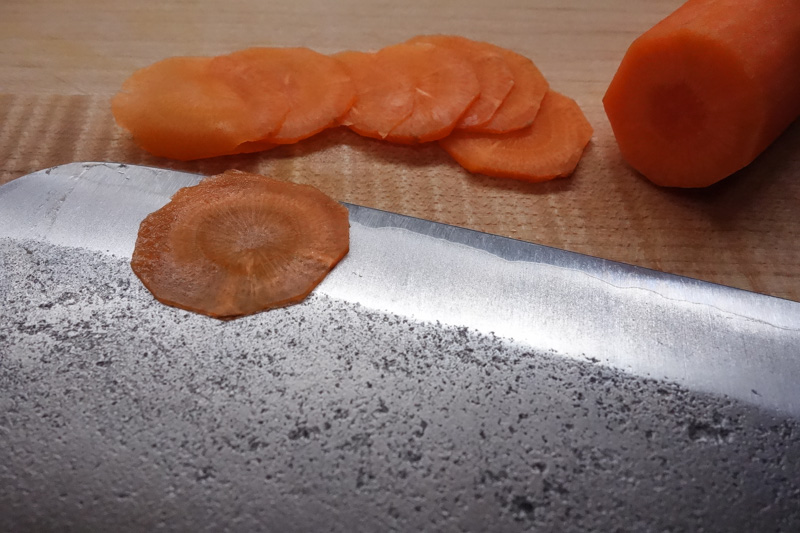 Das Koichi ist nämlich etwas balliger, die Klinge ganz leicht ausgeprägter konvex geschliffen. Da ist es wieder: Schlank ausgeschliffen, leicht ballig auf Null!! Da hilft kein weiteres Ausdünnen hinter der Wate. Je nach Schliff ist es auch kontraproduktiv. Trotz minimal schlankerer Klinge des Yuki ebendort, gleitet das konsequent konvex durchgeschliffene Koichi einen Tacken leichter durch kompaktes feuchtes Schnittgut à la Möhre.