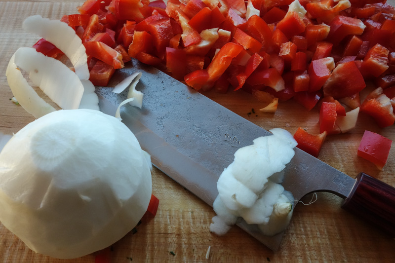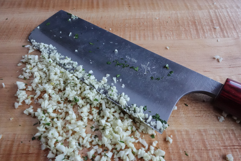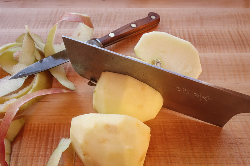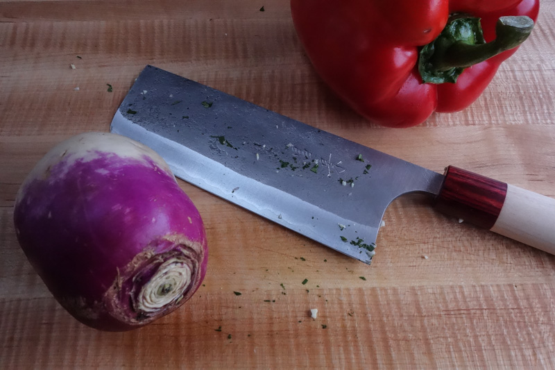 Gut geeignet ist die massige Klinge des Masakage-Nakiri als Schaufel für Schnittgut. Deutlich größer als das Santoku Little von Jürgen Schanz, läßt sich damit fix die „Platte putzen“. Allerdings ist Vorsicht geboten. Sauscharf, wie die Klinge daherkommt, hat sie gleich beim ersten Streich über das Boos-Brett einen kleinen Span abgehoben. Der Winkel war nicht flach genug. Ein weiteres „gutes“ Zeichen, das die außerordentliche Schärfe dokumentiert, mit der das Masakage aus der Box kommt. Mit etwas leichtem Schaben und 2000er Feinschleifpapier ist das Boos inzwischen wieder voll rehabilitiert. Und wir haben den Winkel, mit dem wir zur Schnittgutaufnahme mit der Klinge über das Brett streichen, auf angemessen flache nullkommadings Grad abgesenkt.