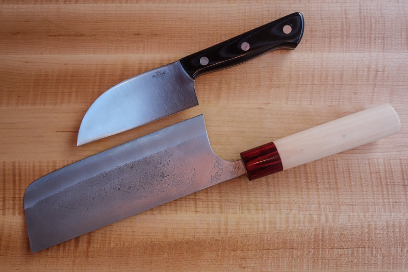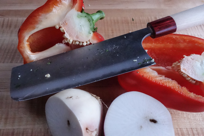Parallel zum Thema Stahl quält uns seit langem der Reiz, dem Roadhouse das klassisch japanische Gemüsemesser - ein echtes Nakiri - zuzuführen. Für die ganz großen Schoten! Womit wir dann vermutlich vollständig zum Vegetarier mutieren werden. Immer wieder hin- und hergerissen von allen möglichen Schneidgeräten dieser Art, war am fernen Horizont das Herder Nakiri in Sicht geblieben. Von Herder-Hardlinern gern empfohlen, lag es ja eigentlich auch nahe. Dieser solingisch dünngeschliffene Carbonstahl ist aber auch unwiderstehlich. Das kesselt