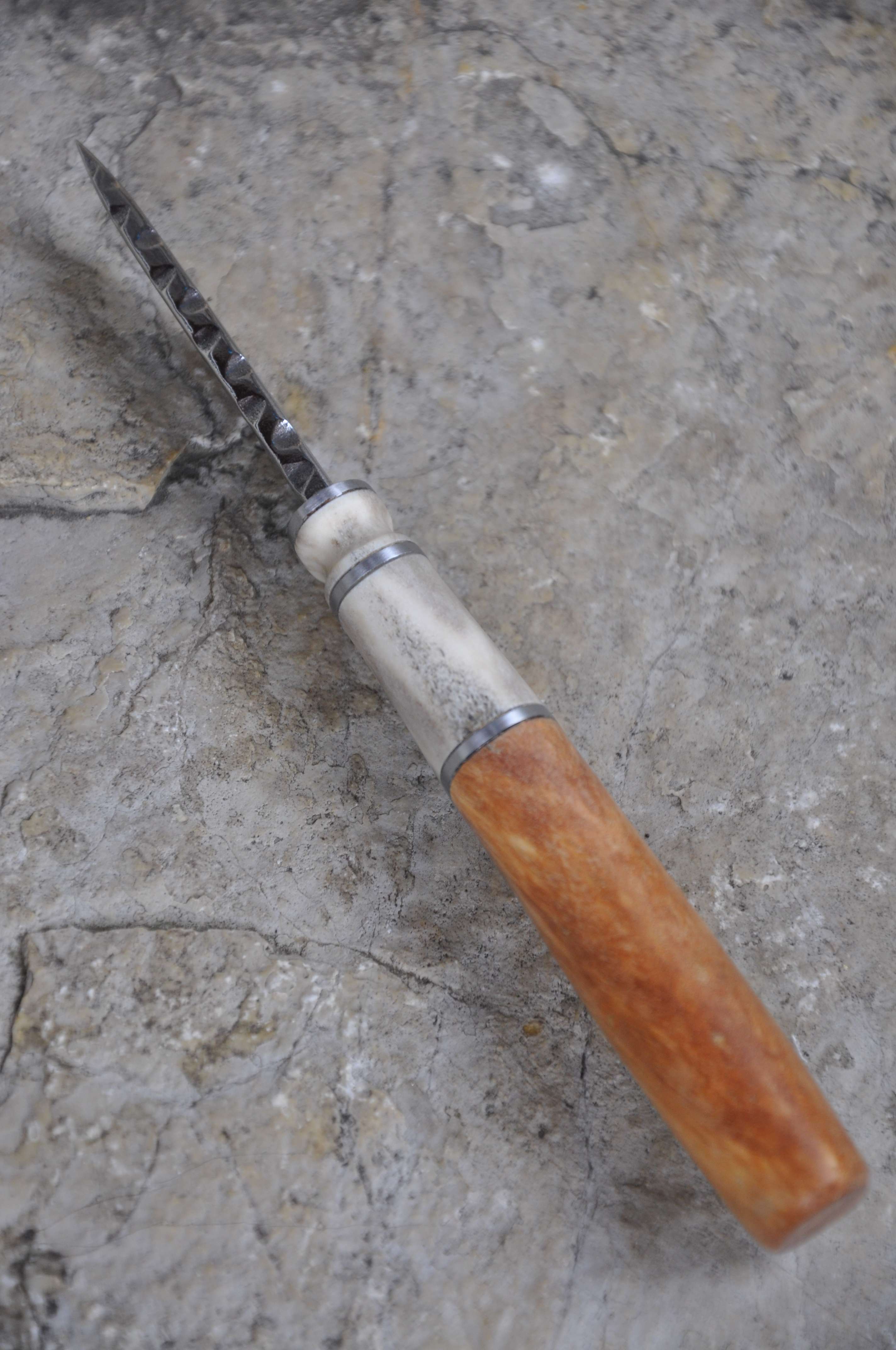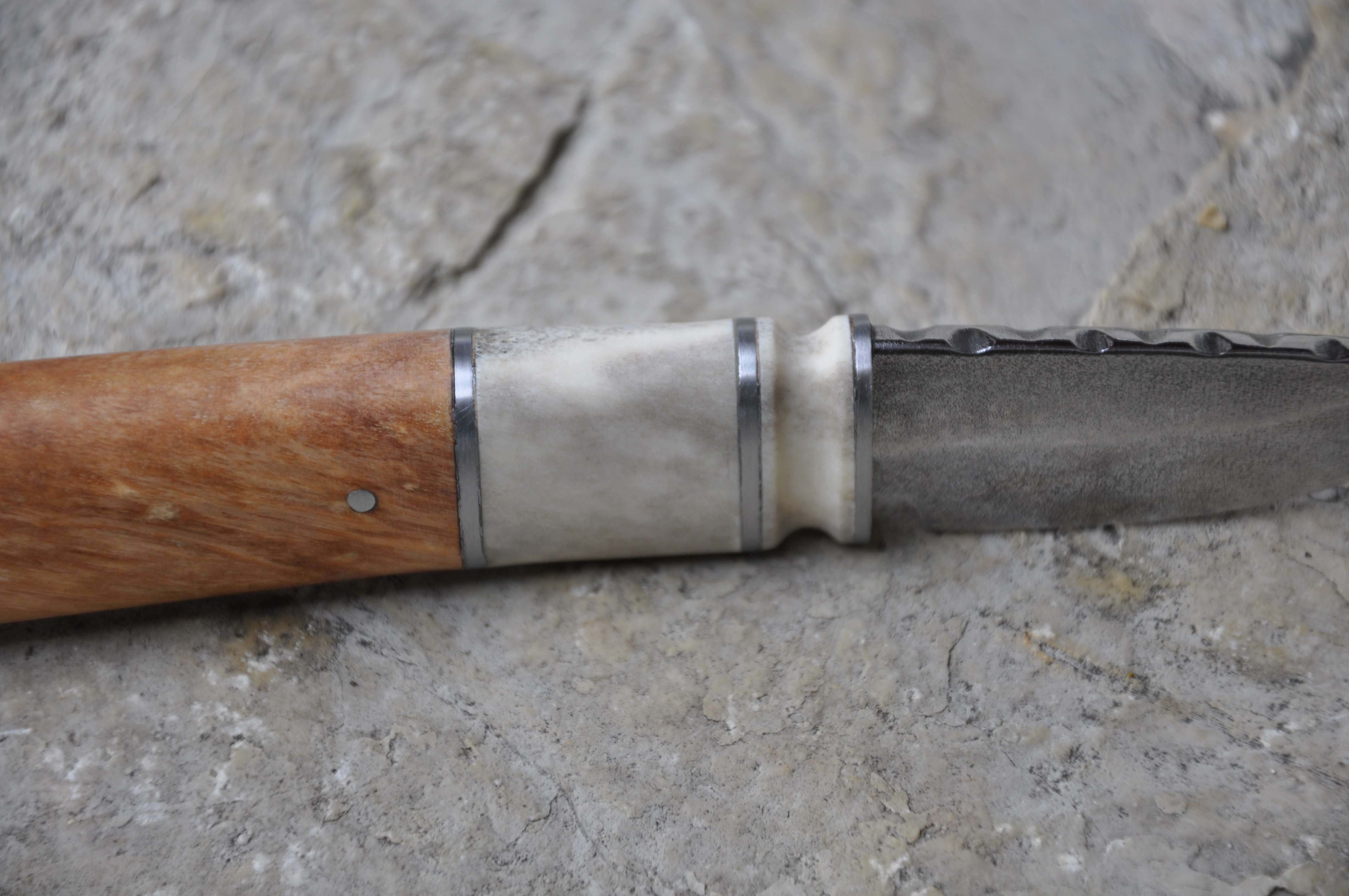 Griff : unbekanntes Holz, Rentier und Stahlspacer.