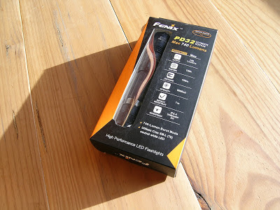 Die PD32 UE kommt in der von Fenix bekannten Schachtel in Schwarz und Orange mit Sichtfenster. Daneben finden sich diverse Angaben zu den Spezifikationen der Lampe. Auf der Rückseite gibt es noch einen kleinen Text über die Weiterentwicklung der PD32 und ein paar technische Daten. Unspektakulär, funktional.