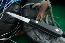Nach dem üblichen „Zalando“, ihr kennt das schon, haben wir uns noch etwas umgeschaut, während der Chef aus den hintersten Gemächern noch etwas Hochwillkommenes hervorholte: 1200er Naßschmirgelpapier und - wir konnten es nicht fassen - auch noch solches der Körnung 2000. Annähernd der Ohnmacht nahe vor Freude, erreichten wir den Ausgang, als uns ein kurzer, stabiler, metallisch glänzender Gegenstand mit dunklem Griff ins Auge stach: Ein Austernmesser (besser -dolch) der portugiesischen Firma ICEL, von denen wir schon das ein oder andere Taschenmesser unser Eigen nennen. Ohne Zögern entschieden wir uns zum Erwerb.