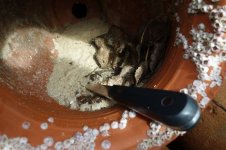 Wir haben ewig gebraucht, um eine Schneidengeometrie herzustellen. Erst mit dem Sharpmaker, dann noch einmal, mit dem Schrubbstein und wieder Sharpmaker. Haben wir einen Spaß gehabt, als die erste Tomate und eine Salatgurke vor uns lagen - fast - wie vom Windmühlenmesser erlegt. Äpfel (UND Kartoffeln) schält das „Miststück“ jetzt auch. Stullen schmieren geht, Käse schneiden ebenso. Mandeln schneidet es in eine Art Scheiben, eine Herausforderung für jedes Messer, die das Neck Bowie allerdings deutlich eleganter löst. Der Grad der Befriedigung war also noch im niedrigen Bereich, denn die Schärfe hätte schärfer sein können. Also Sharpmaker wieder raus aus der Kiste and again and again. Den Abtrag kann man auf dem Foto ganz gut erkennen. Jetzt isses besser - aber wie schon Freiherr zu Lichtenberg einst meinte: „Es ist nicht sicher, daß es besser wird, wenn es anders wird - eins ist jedoch gewiss, daß es anders werden muß, wenn es besser werden soll!“