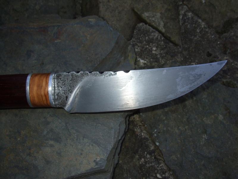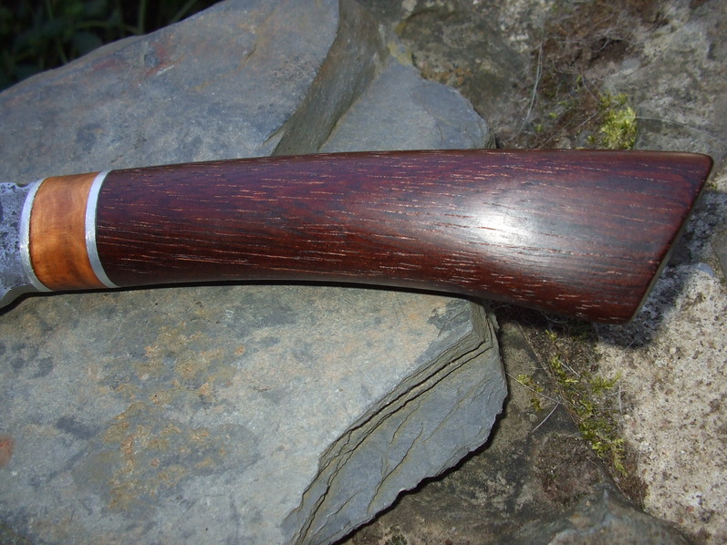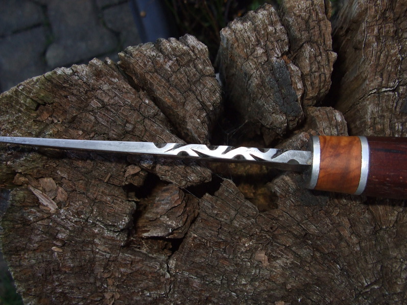 mir gefallen schon seit Jahren die Messer im "Persian Style". Jetzt habe ich auch mal eins gemacht. Einen richtig derben Perser. Die Klinge ist aus Federstahl geschmiedet und im Lehmmantel gehärtet. Der Griff besteht aus Alu-Olive-Alu-Bongossi. Ich nehme Bongossi ganz gerne, weil es ziemlich unverwüstlich ist. Und ich finde, dass es noch nicht mal schlecht aussieht.