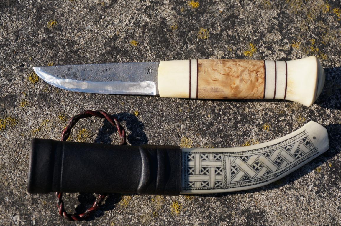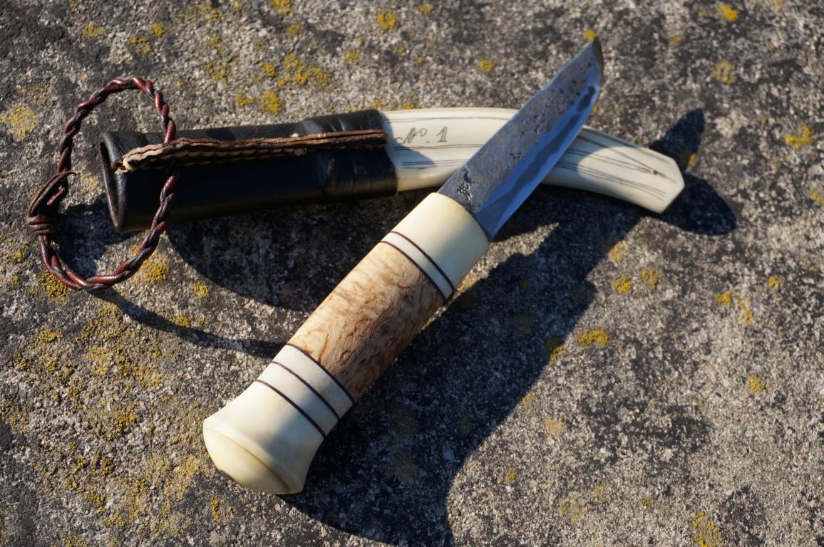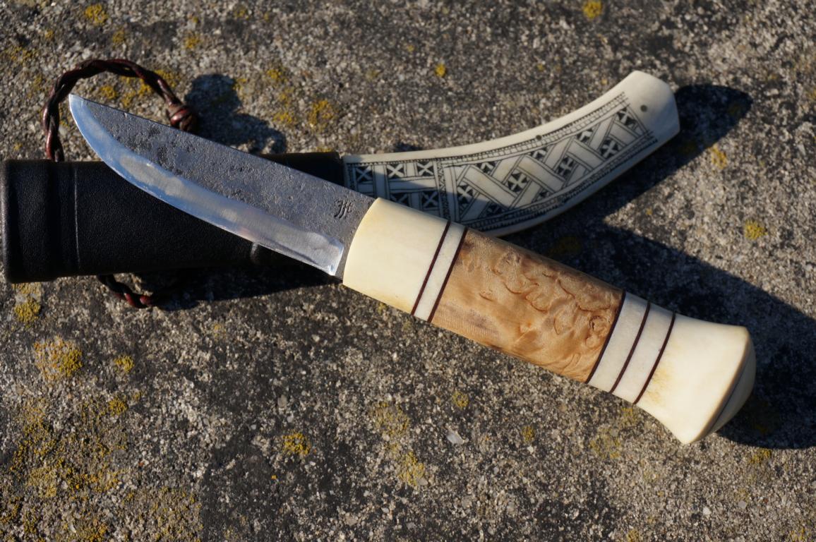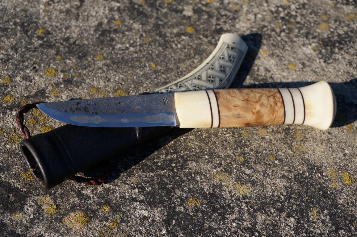 Das herrliche Messer hat eine 8 cm lange 3-Lagen-Klinge (San-Mai), einen mehrteiligen Griff aus Maserbirke und Rentier sowie einem am Knauf vernieteten Erl. Die Scheide ist für sich genommen bereits ein Kunstwerk. Wenn man dieses Ensemble in den Händen hält, fühlt sich das auf eine ganz eigene Weise besonders an. Klingt bekloppt, ist aber so