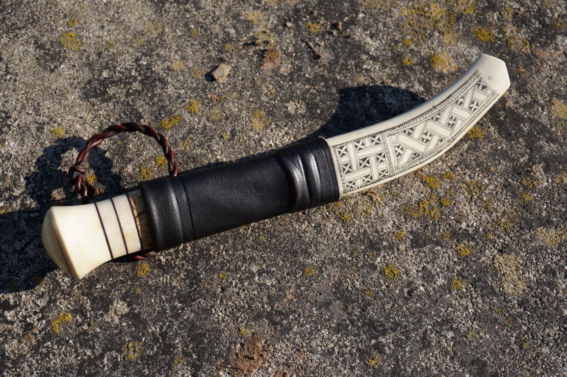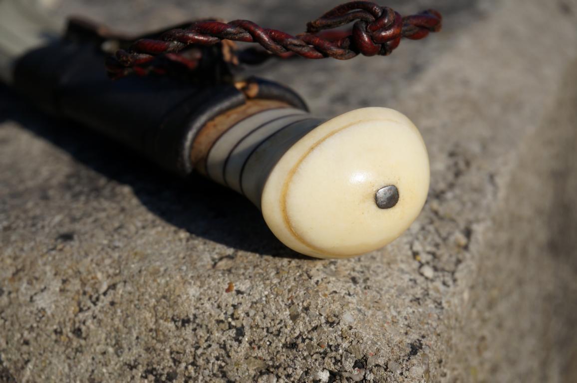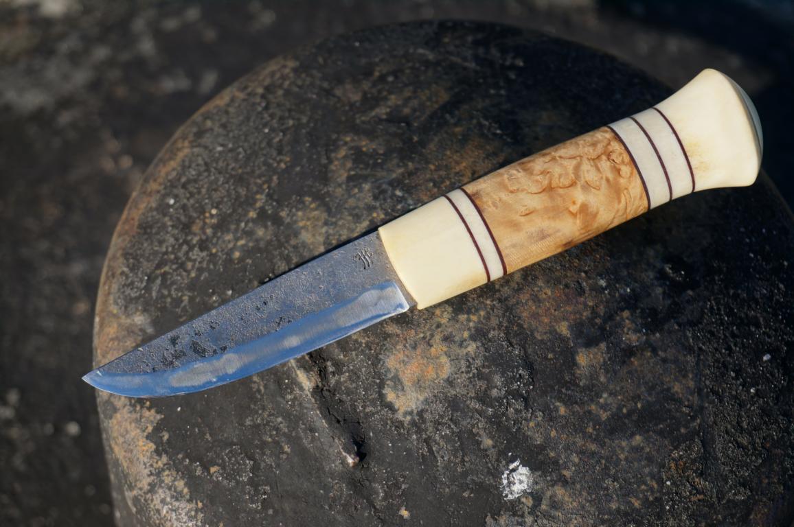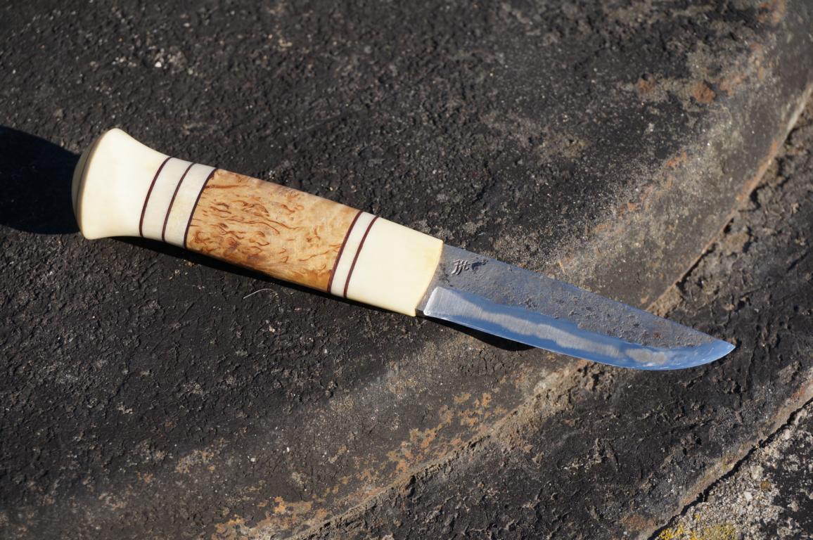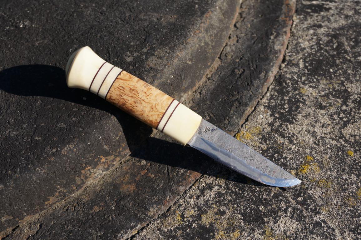 Das herrliche Messer hat eine 8 cm lange 3-Lagen-Klinge (San-Mai), einen mehrteiligen Griff aus Maserbirke und Rentier sowie einem am Knauf vernieteten Erl. Die Scheide ist für sich genommen bereits ein Kunstwerk. Wenn man dieses Ensemble in den Händen hält, fühlt sich das auf eine ganz eigene Weise besonders an. Klingt bekloppt, ist aber so