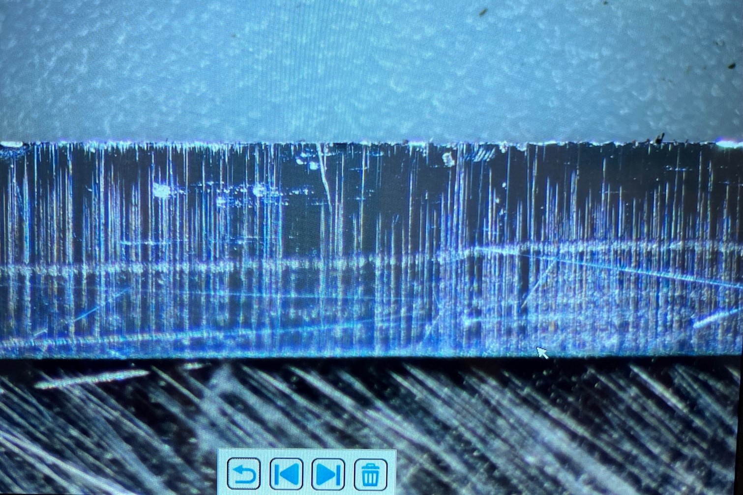 Links im Bild ist aus meiner Sicht erkennbar, dass die Riefen vom gröberen Schleifmittel noch bis zur Schneidkante ragen. Diese Bereiche sind wie Sollbruchstellen bei der Nutzung. Hier kollabiert die Schneide schneller, wenn die Spuren nicht bis zur Schneidkante mit den feineren Schleifmitteln entfernt werden. Darauf solltest du wenn möglich achten.