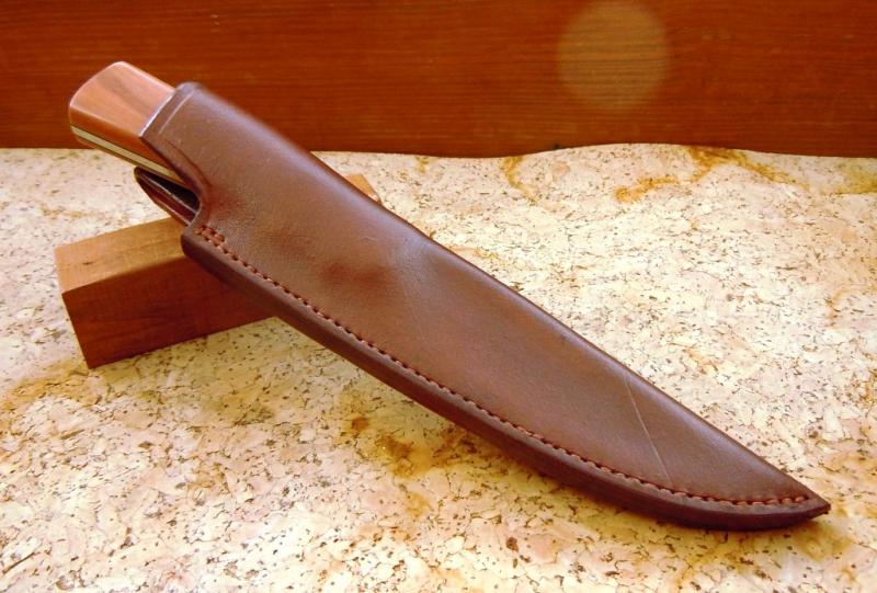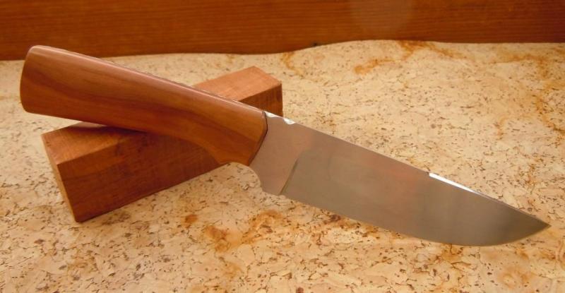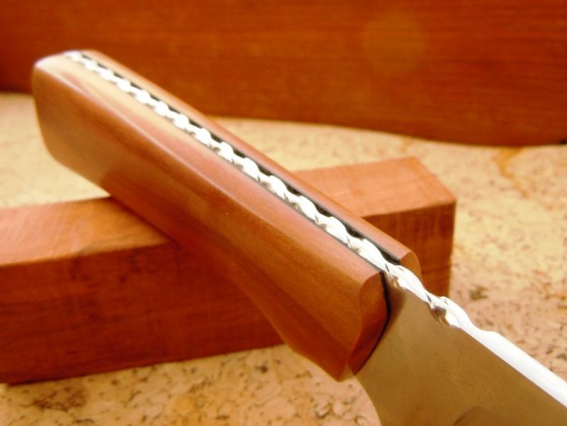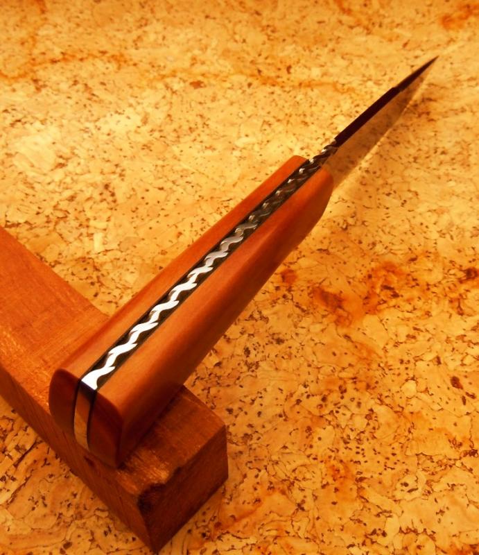 Es hat die gleichen Gene wie mein letztes Messer welches ich hier präsentiert habe (gleiche Vorlage aber etwas länger). Nur hat dieses Messer hier eine viel hellere Seele. Gemacht wurde es für eine Frau. Eine gute Bekannte der Familie, die schon Jahrzehnte bei den Pfadfindern aktiv ist, hat neulich mal so nebenher erwähnt, dass sie als einzige ihres Stammes kein Messer hat. Nun jetzt wird sie bald eines haben. (Ich wollte es heute zu ihr bringen, nur sie ist in Florenz)