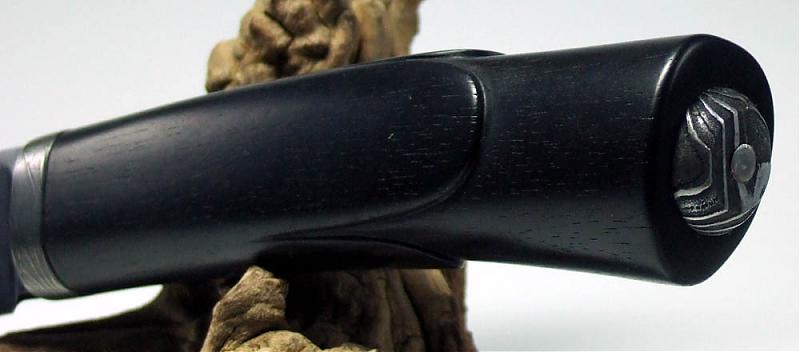 Sein Gefieder ist aus Ebenholz und Sprengdamast (Zwinge und Kappe).