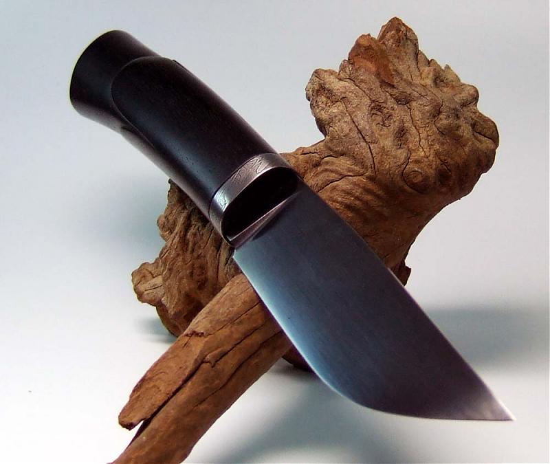 tolle Kombination! Brünierte Klinge mit Damastzwinge sieht einfach wunderschön aus. Der Griff gefällt mir auch sehr gut, obwohl ich ja sonst nicht so auf Schnitzereien stehe. Das Gesamtbild passt einfach.