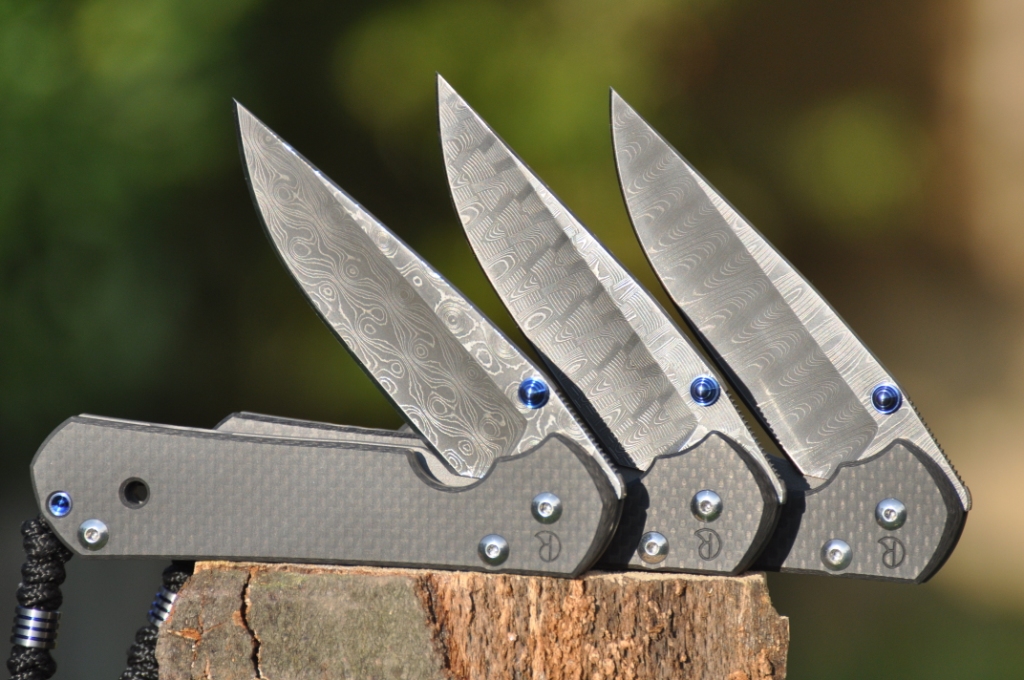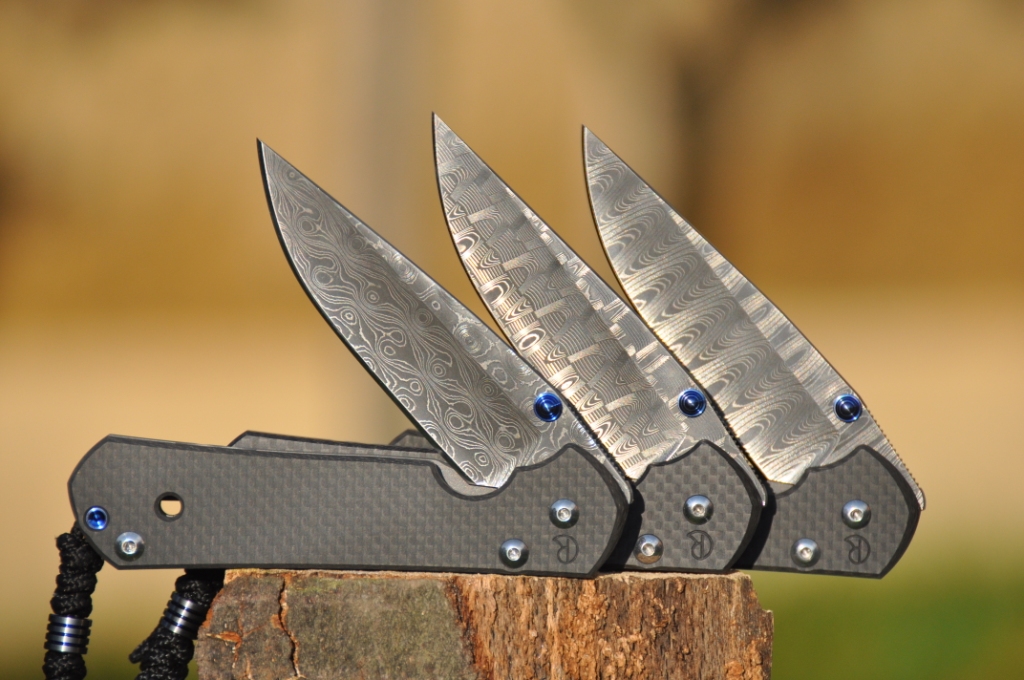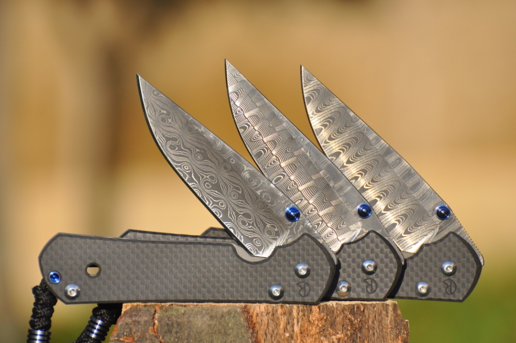 CF Sebenza 21 and Basket Weave Damascus + CF Sebenza 21 and Ladder Damascus + CF Sebenza 21 and Raindrop Pattern Damascus