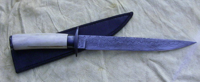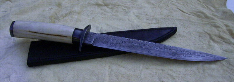 Die Klinge habe ich aus 80 Lagen wildem Damast geschmiedet; hierin verarbeitet habe ich Kugellagerschalen Feile und ein olles Ackergerät, so ne Art Pflugschar. Der Damast ist zweimal auf die Hohe Kante geschweisst, deshalb auch der unübliche Anblick.