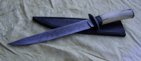 Die Klinge aus ca.120 Lagen Damast habe ich spiesskant ausgeschmiedet, um ein wilderes Muster zu erhalten. Verarbeitet habe ich hier Feile, Flugzeuglagerschalen, und Pflugschar. Daraus ergibt sich eine Mischung, die sich wirklich scharf abziehen lässt.