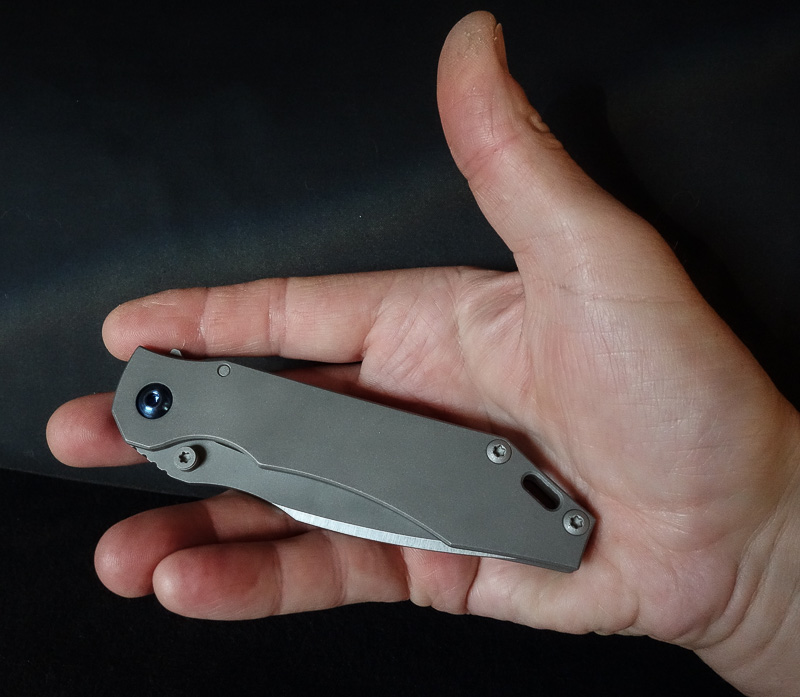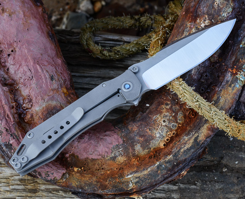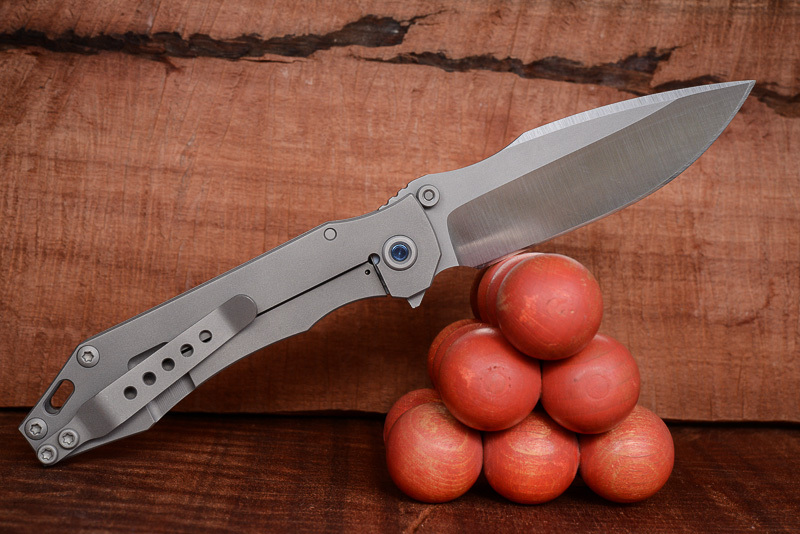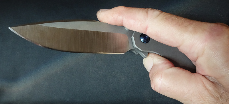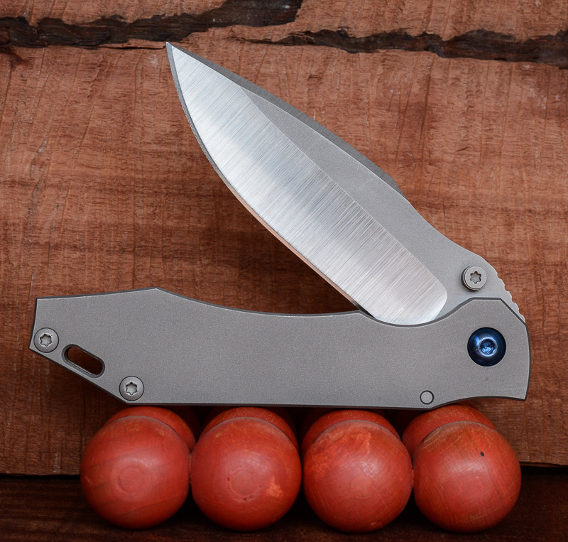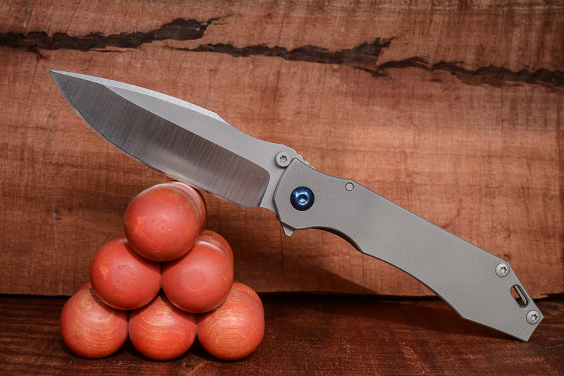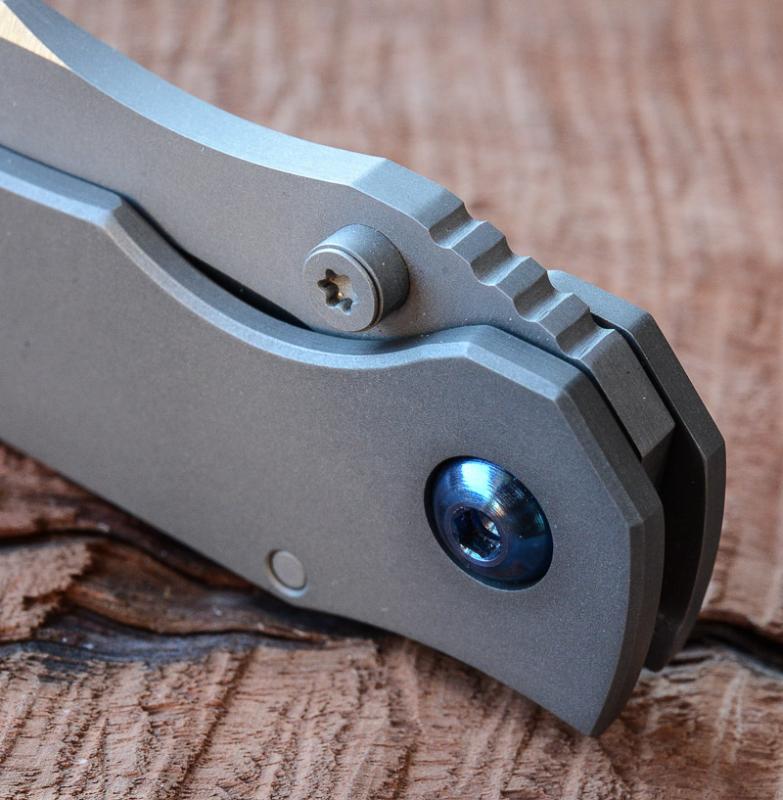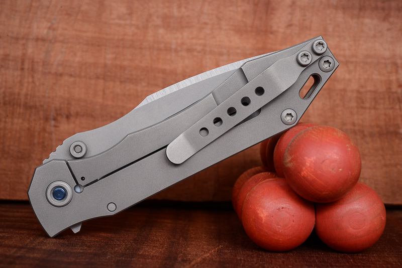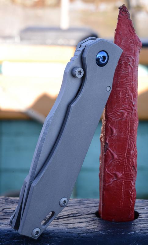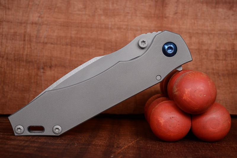 „Red Rock“, „Little Red Rock“ und das „Böse“ haben also Gesellschaft erhalten. Gefertigt einzig aus Stahl und Titan (mit Ausnahme der Teflonwasher) liegt der Flipper in seiner schlichten Eleganz vor uns auf dem Tisch. Von Kopf bis Fuß ganz Graue Eminenz. Bis auf den Anschliff der Klinge und die falsche Schneide zeigen alle Teile das gleiche mattgestrahlte Grau. Die blaue Titan-Achsschraube - zu der wir uns in förmlich allerletzter Minute entschieden haben - unterstreicht den coolen Auftritt: Cold as ice!