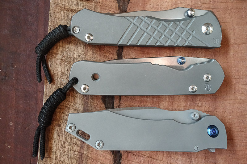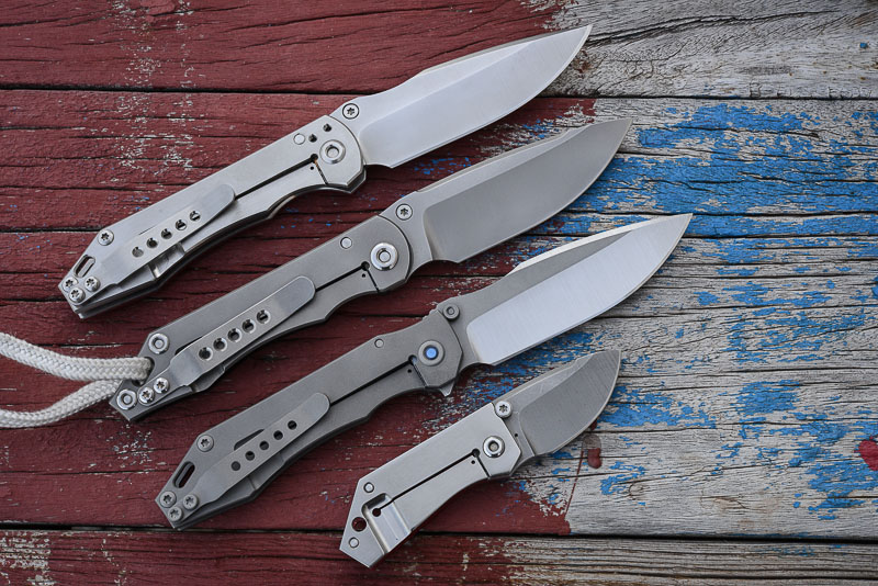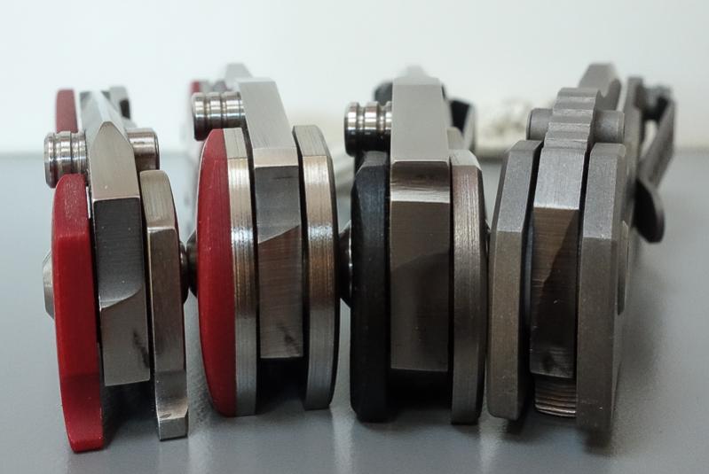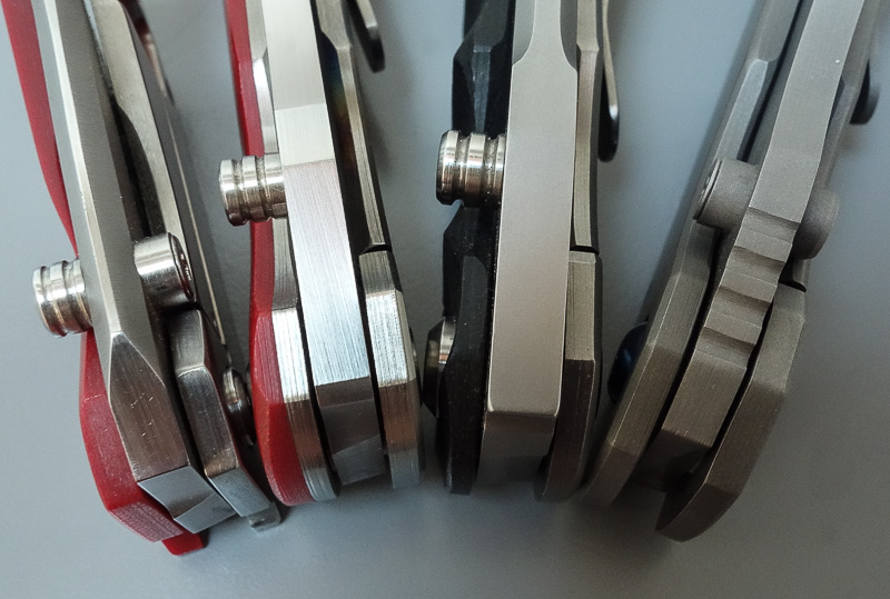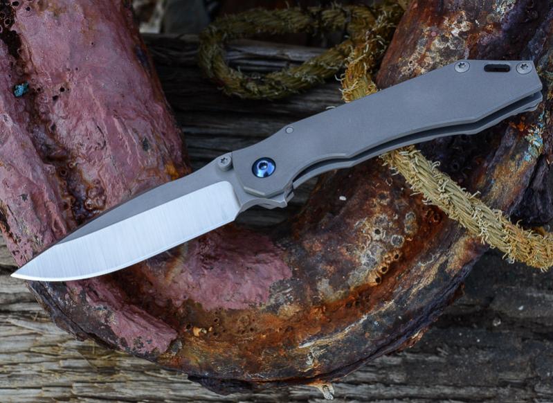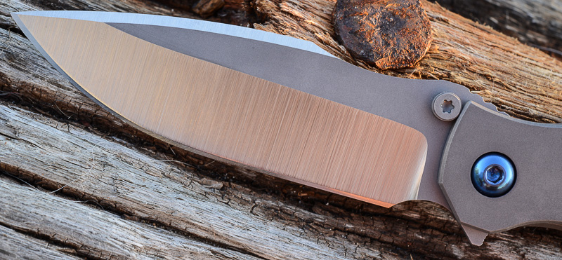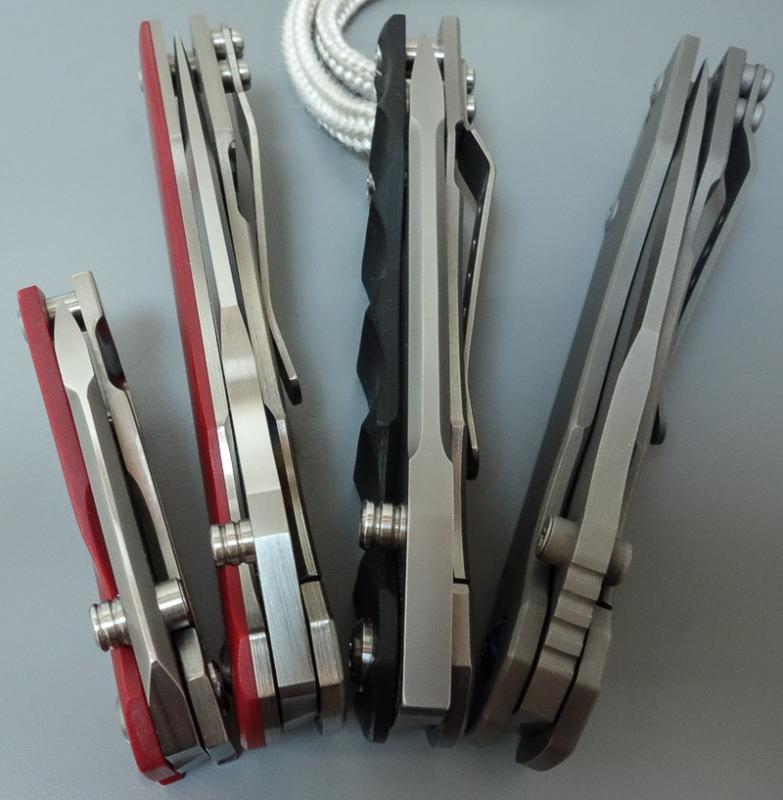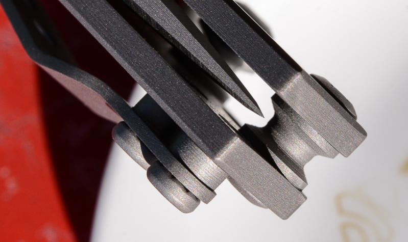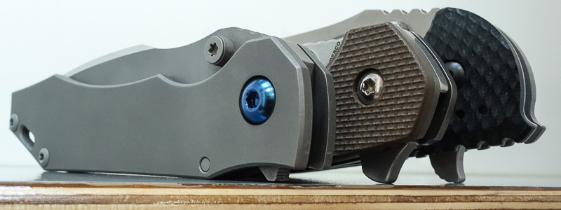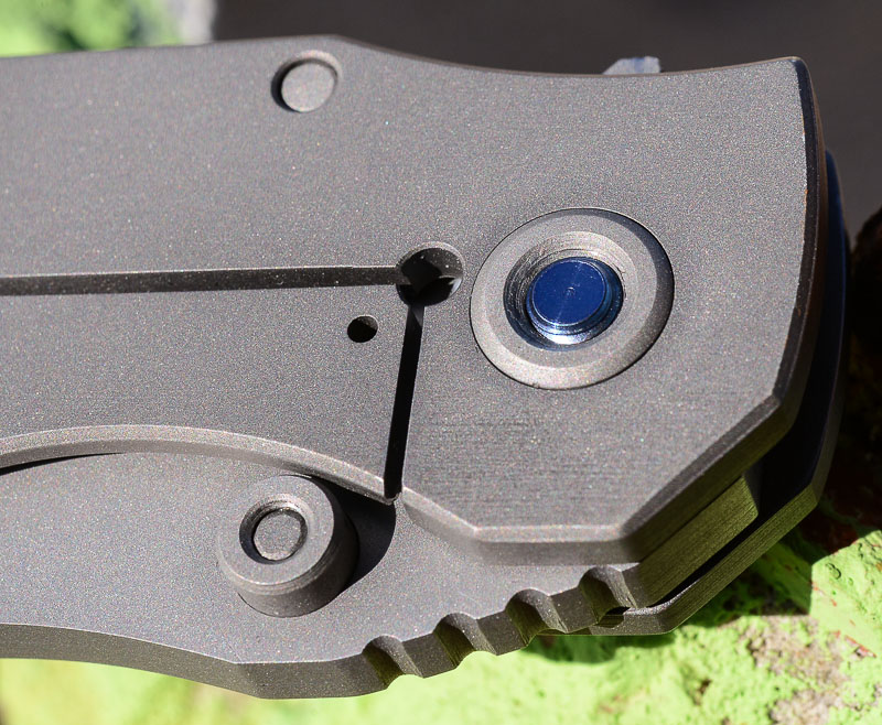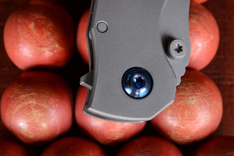 „Red Rock“, „Little Red Rock“ und das „Böse“ haben also Gesellschaft erhalten. Gefertigt einzig aus Stahl und Titan (mit Ausnahme der Teflonwasher) liegt der Flipper in seiner schlichten Eleganz vor uns auf dem Tisch. Von Kopf bis Fuß ganz Graue Eminenz. Bis auf den Anschliff der Klinge und die falsche Schneide zeigen alle Teile das gleiche mattgestrahlte Grau. Die blaue Titan-Achsschraube - zu der wir uns in förmlich allerletzter Minute entschieden haben - unterstreicht den coolen Auftritt: Cold as ice!