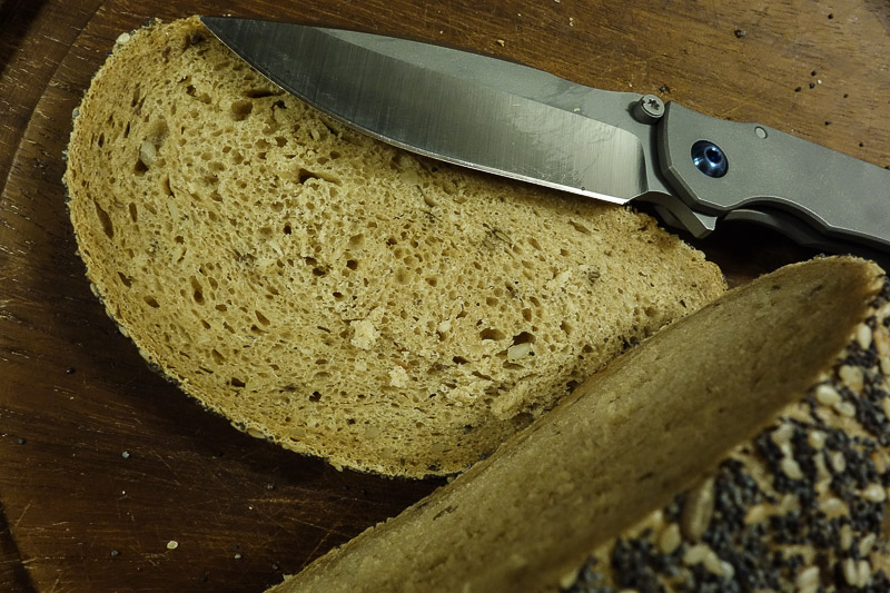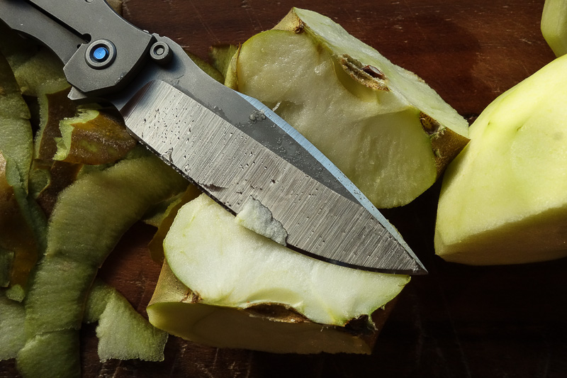 Als da wären Äpfel, Käse, Tomaten - die übliche Routine also. Eine astreine Scheibe vom großen Brot und etwas Holzbearbeitung. Den (groben) Küchendienst hat das gute Stück erwartungsgemäß zufriedenstellend erledigt, bei der Holzbearbeitung wurde er dann lebhafter. Schnitzen, schälen, schneiden: Der SGF ist in seinem Element. Und anschließend geht die Klinge ohne jegliche Ermüdungserscheinung durchs Papier. Keine Mikro-Ausbrüche weit und breit, keine Beeinträchtigung der Schärfe. Am Ende mit der Spülbürste und etwas Spülmittel locker die Klinge entlang - der Sauerei wegen. Dabei hatten wir allerdings nicht mehr daran gedacht, daß er rasiert