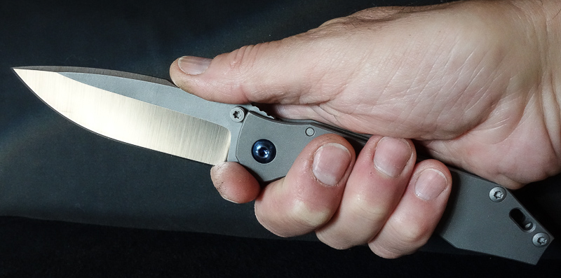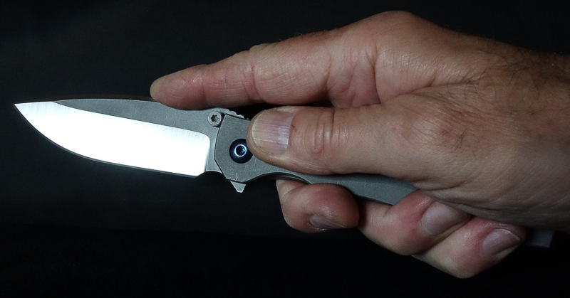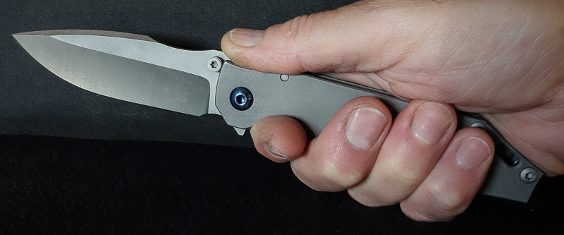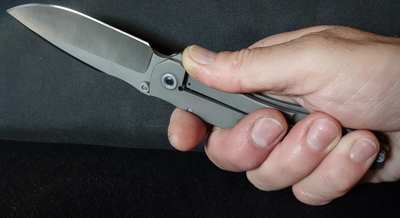 Der „Knubbel“ ist im Vergleich zu anderen Flippern auffallend klein. Man traut ihm zunächst gar nicht richtig über den Weg. Aber man irrt. Ausgelöst durch gewohnt normalen Kraftaufwand und einen kleinen Schlenker aus dem Handgelenk gleitet die Klinge auf Teflonwashern durchgehend bis zum Endpunkt. Beim Entriegeln der Lockbar ist etwas mehr Energie erforderlich als z.B. beim SBH. Zunächst wird die Klinge vom „Knubbel“ am Daumen abgebremst und kann dann - nach dem Umgreifen - ruhig und gefahrlos geschlossen werden. Der stramm sitzende Lock bewirkt, daß die Klinge nicht fingergefährdend hin- und herrauscht, sondern in jeder gewünschten Position stehen bleibt und der Schwerkraft Paroli bietet: A Slow Rider.