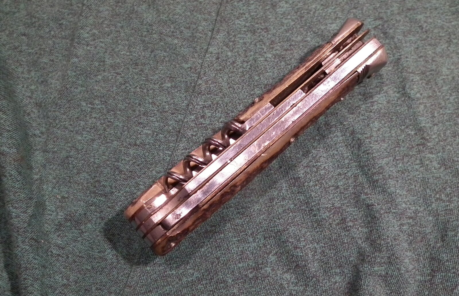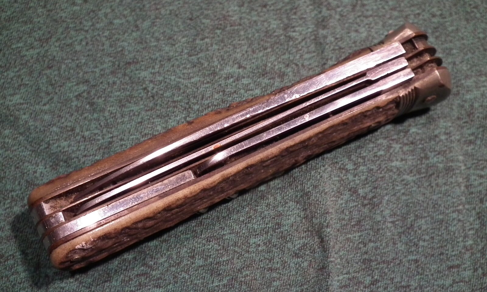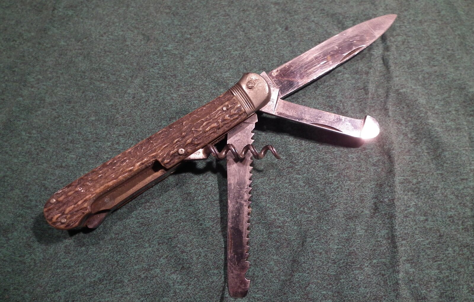 Die Friodur Eishärtung kam 1938, also '38-'41 ca. würde ich sagen.Ich bekam heute dieses Jagdklappmesser geschenkt. Traurigerweise sind alle Federn gebrochen. Die Hauptklinge wurde mit einem Hammer misshandelt und anscheinend mehr zum Fugenauskratzen denn zur Jagd benutzt. Säge und Aufbrechklinge scheinen nahezu unbenutzt.