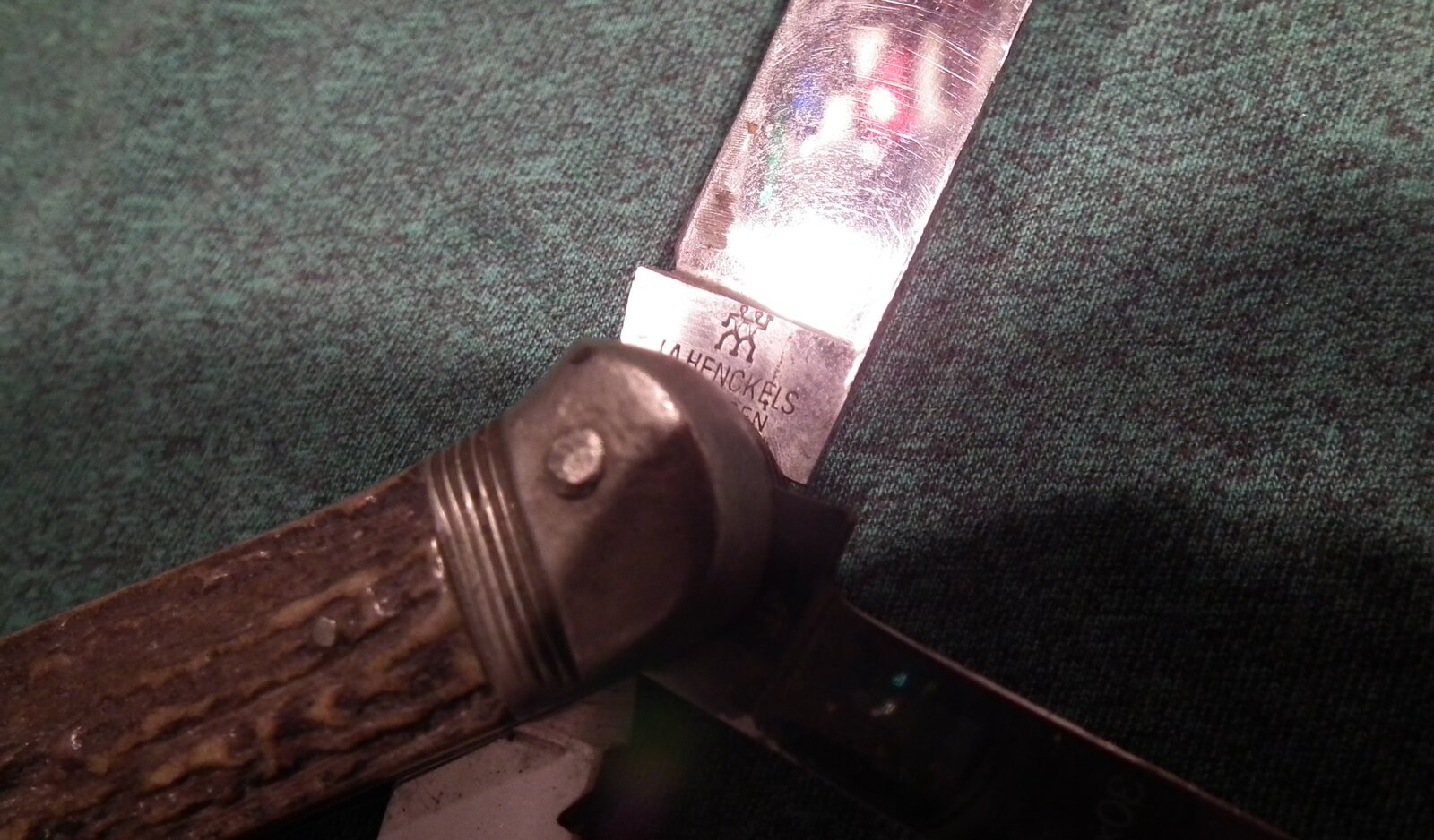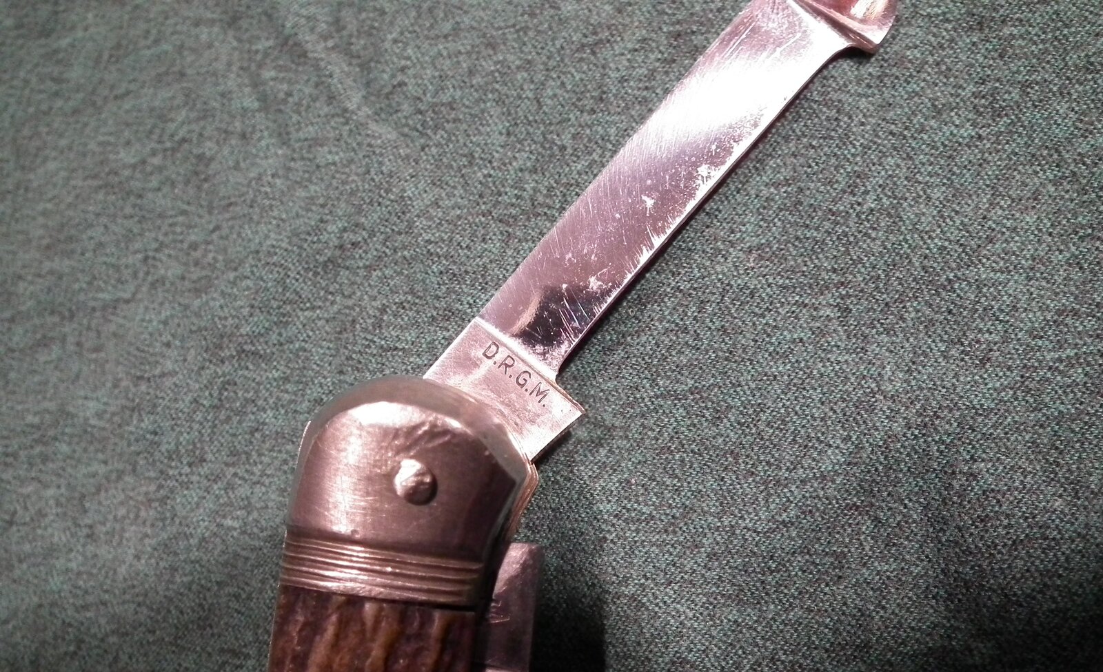 Das Messer ist von Henckels, als Klingenstahl ist "Friodur" angegeben, die Aufbrechklinge trägt die Kennzeichnung "DRGM" und "nicht rostend". Die Grifflänge ist 12 cm, Klingenlänge 9 cm (war vielleicht mal 9,5). Am besten erhalten sind die Hirschhornschalen - deswegen werde ich es auch nicht entsorgen.