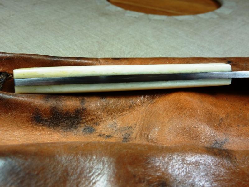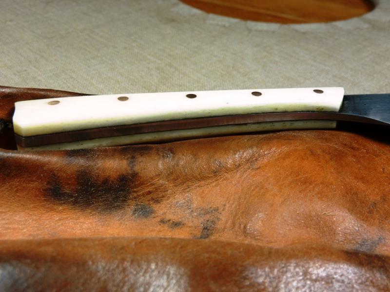 Die Griffschalen sind nicht mit modernem Kleber aufgeklebt sondern durch die Bronzepins fest mit der Angel vernietet. Dazu habe ich die Bohrlöcher in den Griffschalen vorsichtig konisch aufgerieben und mit den Bronzepins vernietet. Zwischen Schalen und Angel habe ich lediglich etwas Schellack-Kopal-Gemisch aufgebracht um zu verhindern, dass Wasser eindringt. Die Griffschalen sind dierekt auf die geschmiedete Oberfläche gesetzt.
