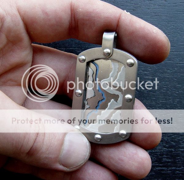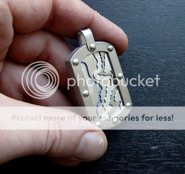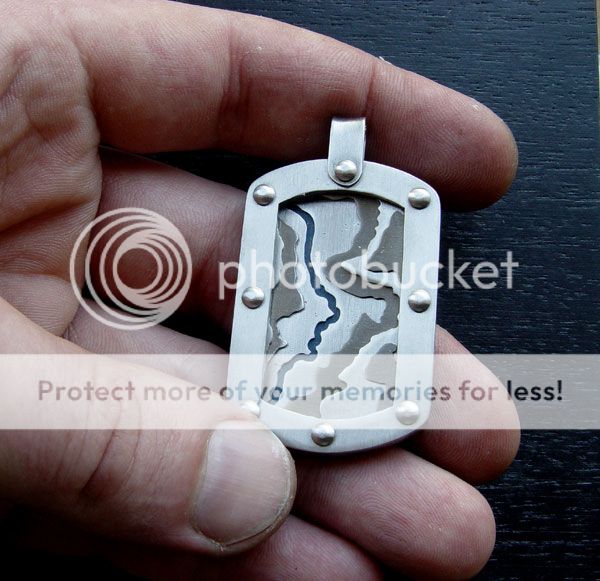 Masse : 30x45x5mm, Gewicht gerade mal 20g. Der Anhänger besteht aus 7 unterschiedlichen Lagen die dann zu nem Massiven Teil vernietet werden. Sehr schön find ich auch den unterschiedlichen Kontrast durch die Satinierungsrichtung - je nach dem wie mans ans Licht hält werden die Lagen unterschiedlich Hell/dunkel. Da aus Titan kann man natürlich auch noch Anodisieren, da ichs aber nicht ganz so farbig mag hab ich mich auf ne blaue Hinterlegung des Flusslaufs beschränkt.