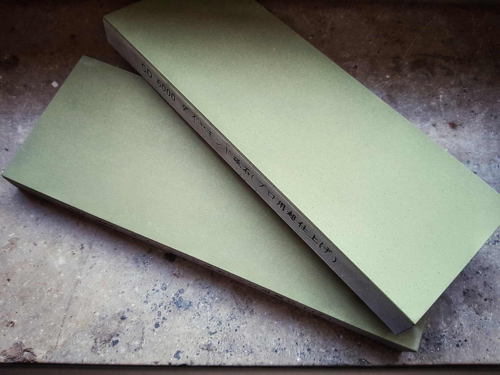 Das nächste, was mich an der Platte nervte: die Diamantfelder auf der 150er Seite sind diagonal durch Streifen ohne Diamantbestückung unterbrochen. Das erzeugt beim Schleifen in ebendiesem Winkel einen Bahnschwelleneffekt. Das fühlt sich äußerst unangenehm an, und zwingt dazu, immer eine Messerpoeitionierung zu wählen, die die Schwellen schräg überfährt.