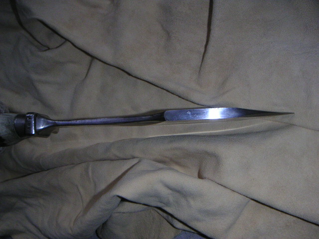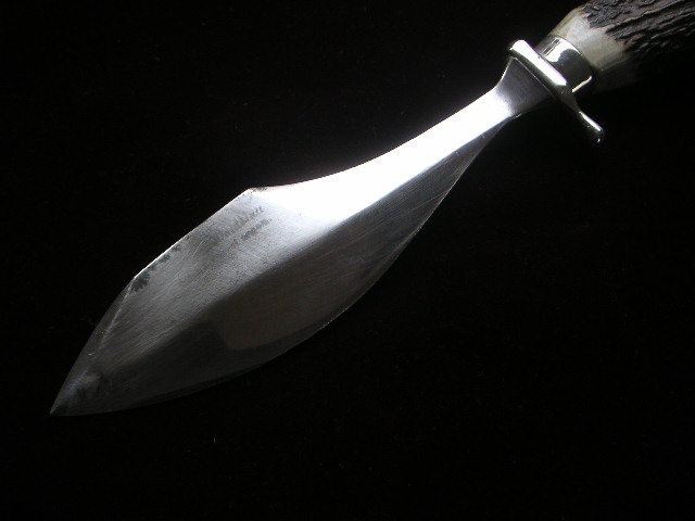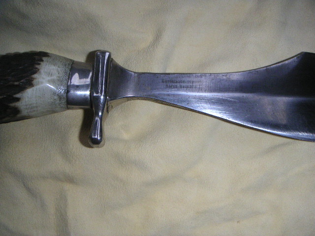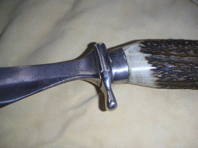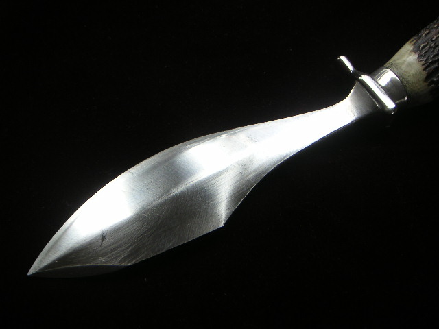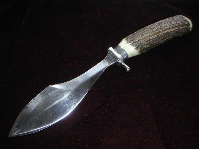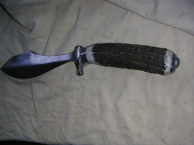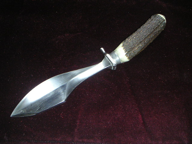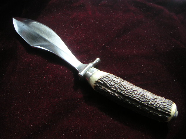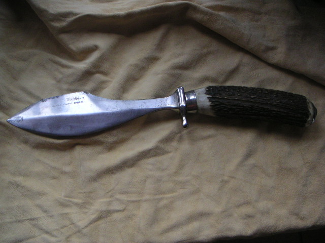 Habe ein sehr,sehr altes Waidblatt mit der Bezeichnung" Scholz Waidblatt Patent angemeldet" mit Hirschhorngriff bekommen.Leider kann ich keine Bilder hochladen. Sehr eigenwillige Klingenform.Bauchige Klinge mit Hammerfläche und Speerspitzenform. Sehr gut verarbeit,handgeschmiedet. Die Klingenform ist unter dem Link zu sehen.( am Ende )Das ist auch ein Waidblatt von Scholz. Mein Hirschhorngriff ist aber so wie beim Gebrauchshirschfänger von Puma 3599 nur der Handschutz ist anders,massiver.Das Waidblatt hat auch einen Schmiedestempel auf dem Hanschutz. Sieht aus wie x 77 oder I 77.Das Messer ist 33,5 cm lang.Die Klingenlänge ist 19cm,Klingenbreite 5 cm und am Heft nur 2 cm. 7mm Klingenstärke an der Hammerfläche.Gewicht 425 gr. Wer kann Angaben zu dem Waidblatt oder dem Hersteller machen?? Bin für jeden Hinweis dankbar!